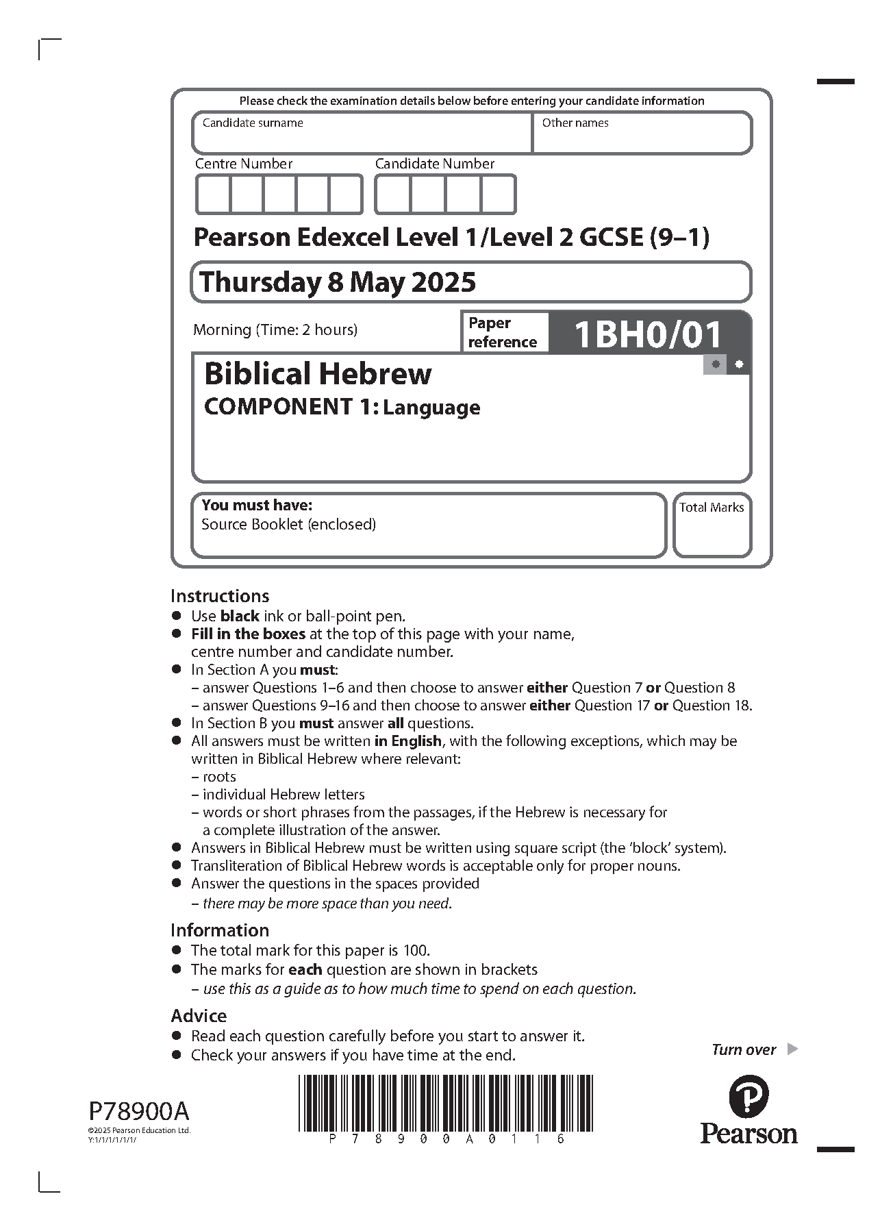 pearson edexcel gcse biblical hebrew paper 1 2025 (1bh0/01: component 1: language). download this verified paper on www....