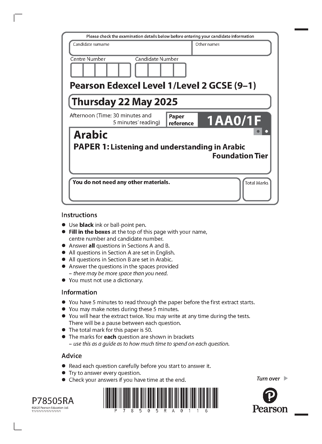 pearson edexcel gcse arabic paper 1 2025 (1aa0/1f: listening and understanding in arabic foundation tier). download this...