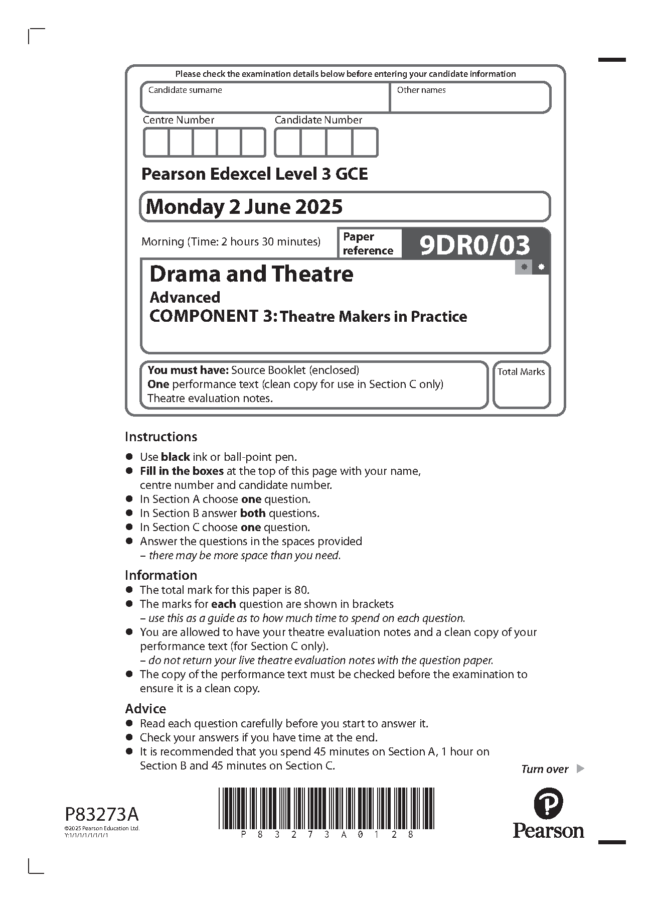 2025 Pearson Edexcel A Level Drama and Theatre PAPER 3 and Mark Scheme Combined (9DR0/03: Theatre Makers in Practice). 2025 Pearson Edexcel A Level Drama and Theatre PAPER 3 and Mark Scheme Combined (9DR0/03: Theatre Makers in Practice) Pearson Edexcel A and AS Papers and Mark Schemes
