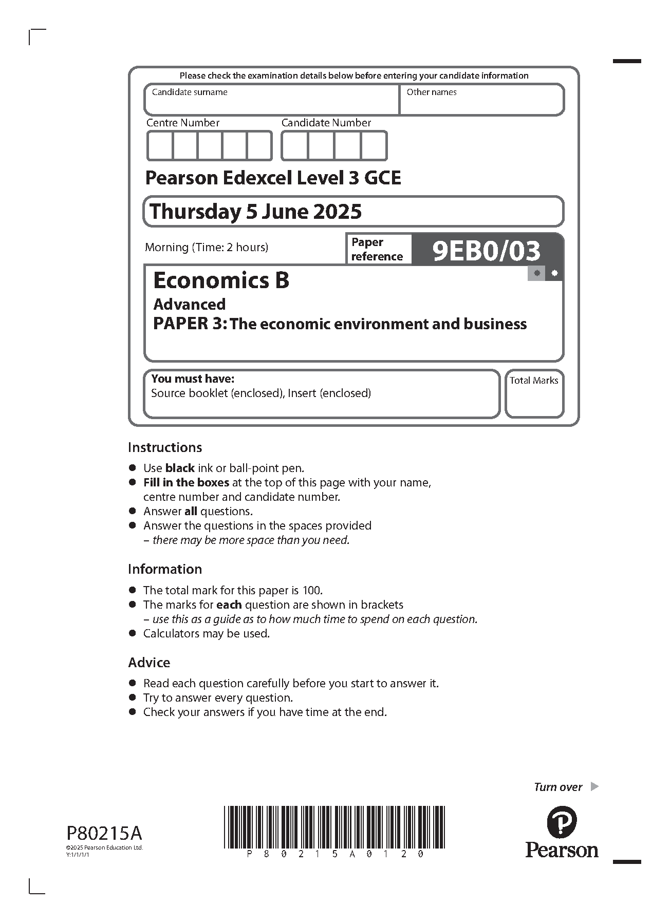 2025 Pearson Edexcel A Level Economics B Paper 3 and Mark Scheme Combined (9EB0/03: The economic environment and business). 2025 Pearson Edexcel A Level Economics B Paper 3 and Mark Scheme Combined (9EB0/03: The economic environment and business) Pearson Edexcel A and AS Papers and Mark Schemes