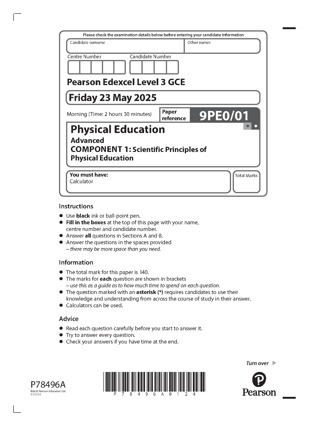 2025 Pearson Edexcel A Level Physical Education Paper 1 and Mark Scheme Combined (9PE0/01: Scientific Principles of Physical Education). 2025 Pearson Edexcel A Level Physical Education Paper 1 and Mark Scheme Combined (9PE0/01: Scientific Principles of Physical Education) Pearson Edexcel A and AS Papers and Mark Schemes