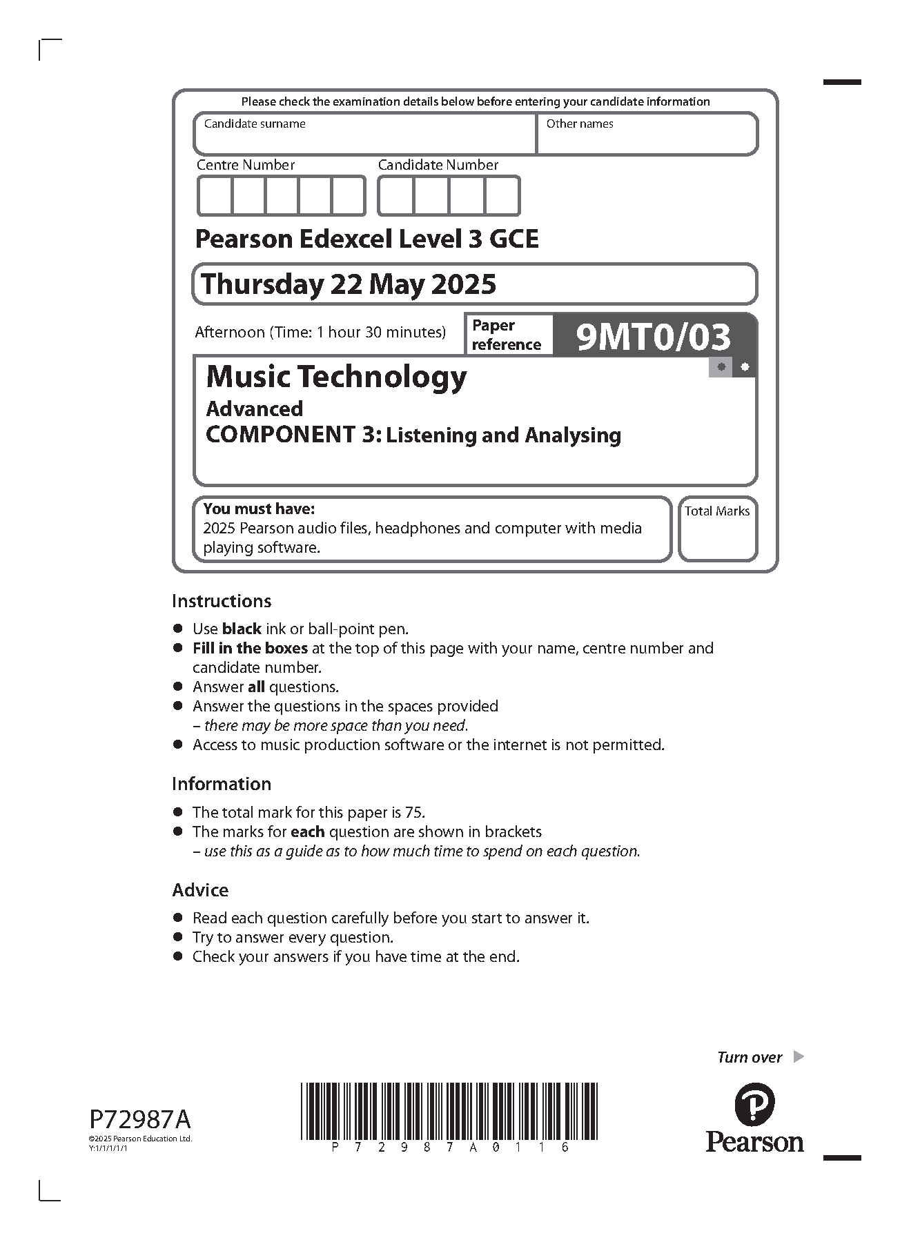 2025 Pearson Edexcel A Level Music Technology COMPONENT 3 and Mark Scheme Combined (9MT0/03: Listening and Analysing). 2025 Pearson Edexcel A Level Music Technology COMPONENT 3 and Mark Scheme Combined (9MT0/03: Listening and Analysing) Pearson Edexcel A and AS Papers and Mark Schemes