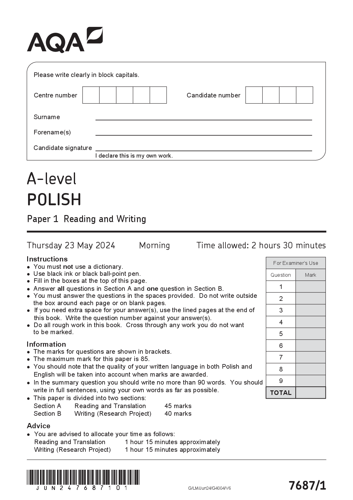 aqa a level polish paper 1 question paper (7687/1: reading and writing). download the official and verified paper on www...