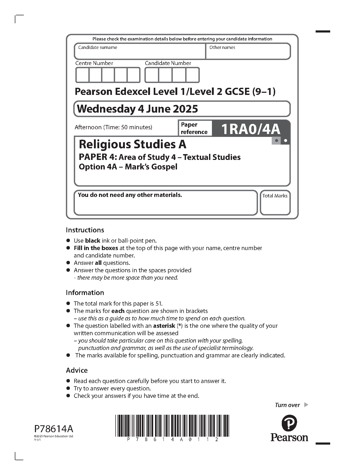 2025 Pearson Edexcel GCSE Religious Studies A PAPER 4 and Mark Scheme Combined (1RA0/4A: Mark’s Gospel). 2025 Pearson Edexcel GCSE Religious Studies A PAPER 4 and Mark Scheme Combined (1RA0/4A: Mark’s Gospel) Edexcel