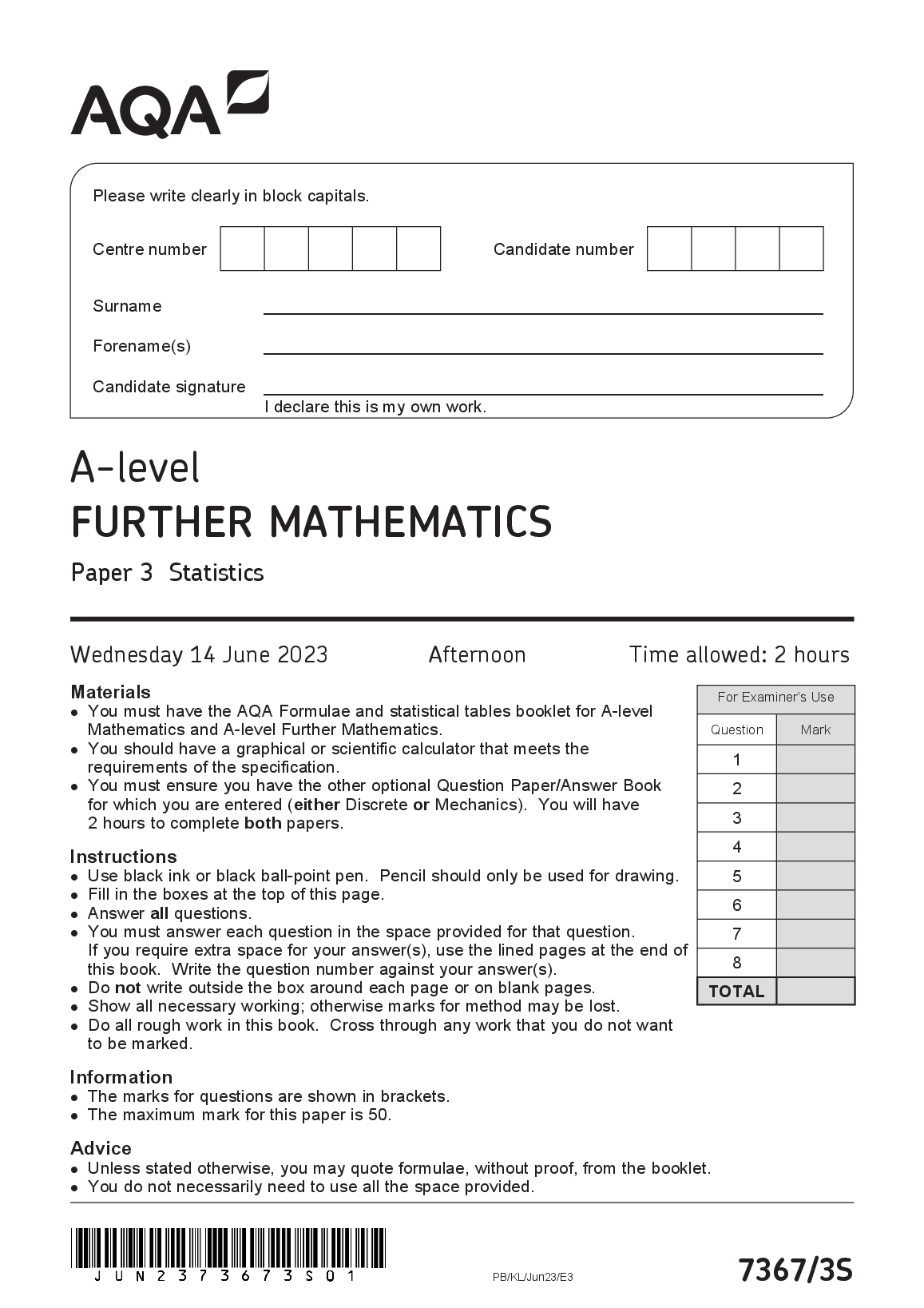 aqa a level further mathematics paper 3s question paper 2023 (7367/3s: statistics)