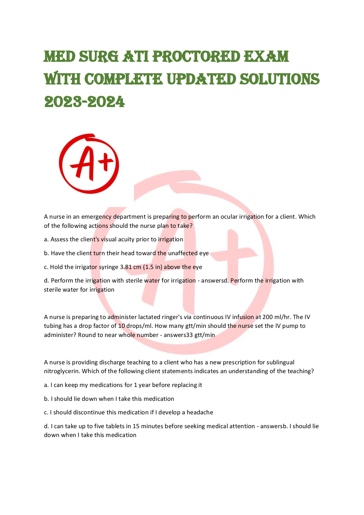 ATI Med Surge Proctored Exam Questions & Answers 2023, 100% Correctly. ATI Med Surge Proctored Exam Questions & Answers 2023, 100% Correctly ATI