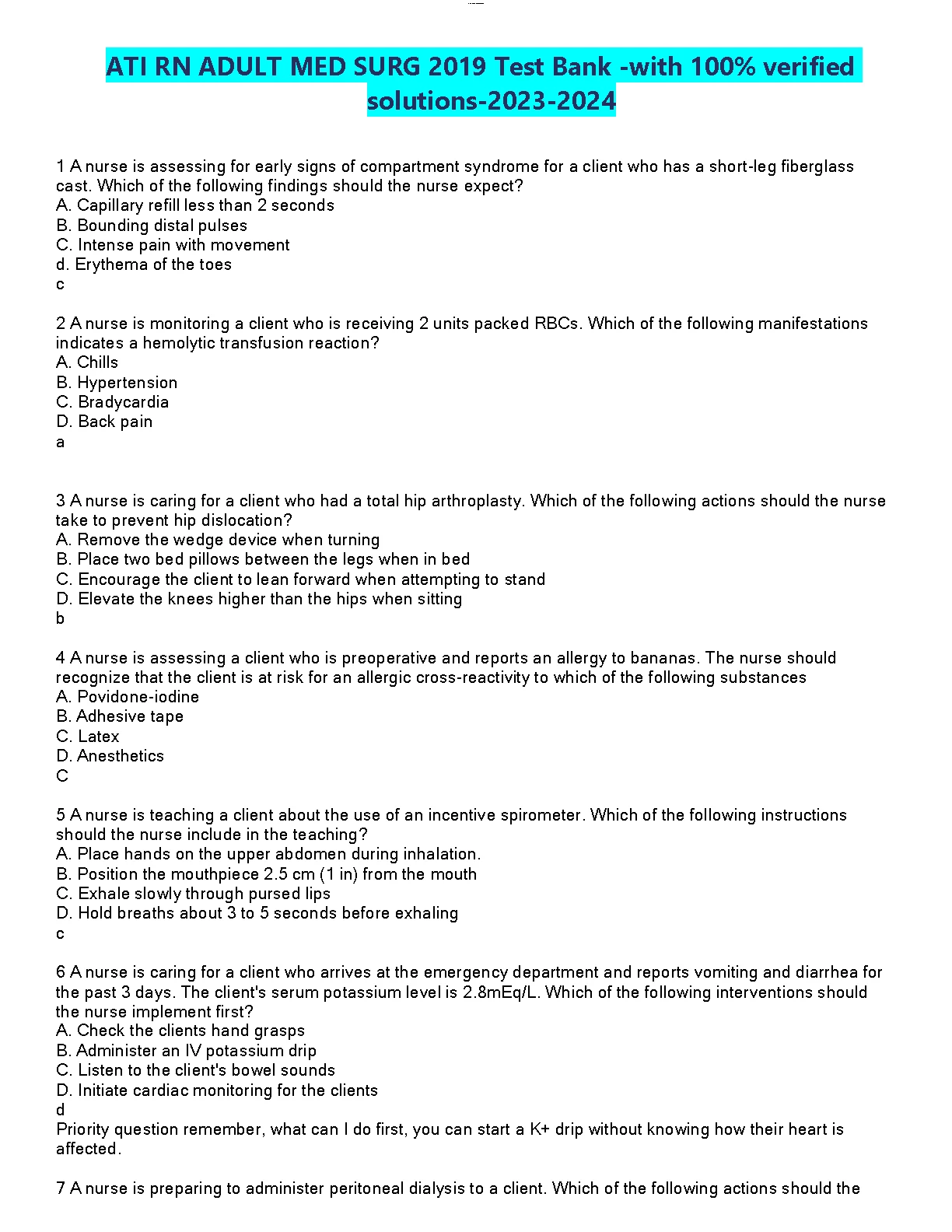 ATI RN ADULT MED SURG 2024 Test Bank. ATI RN ADULT MED SURG 2024 Test Bank TEST BANK