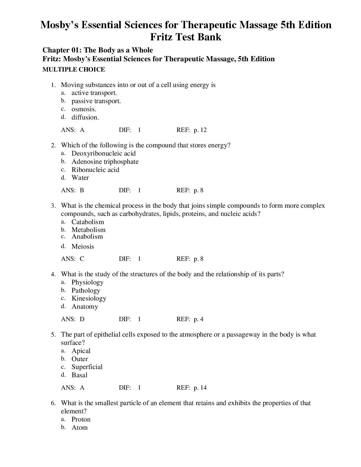 Test Bank for Mosby’s Essential Sciences for Therapeutic Massage 5th Edition by Fritz. Test Bank for Mosby’s Essential Sciences for Therapeutic Massage 5th Edition by Fritz TEST BANK