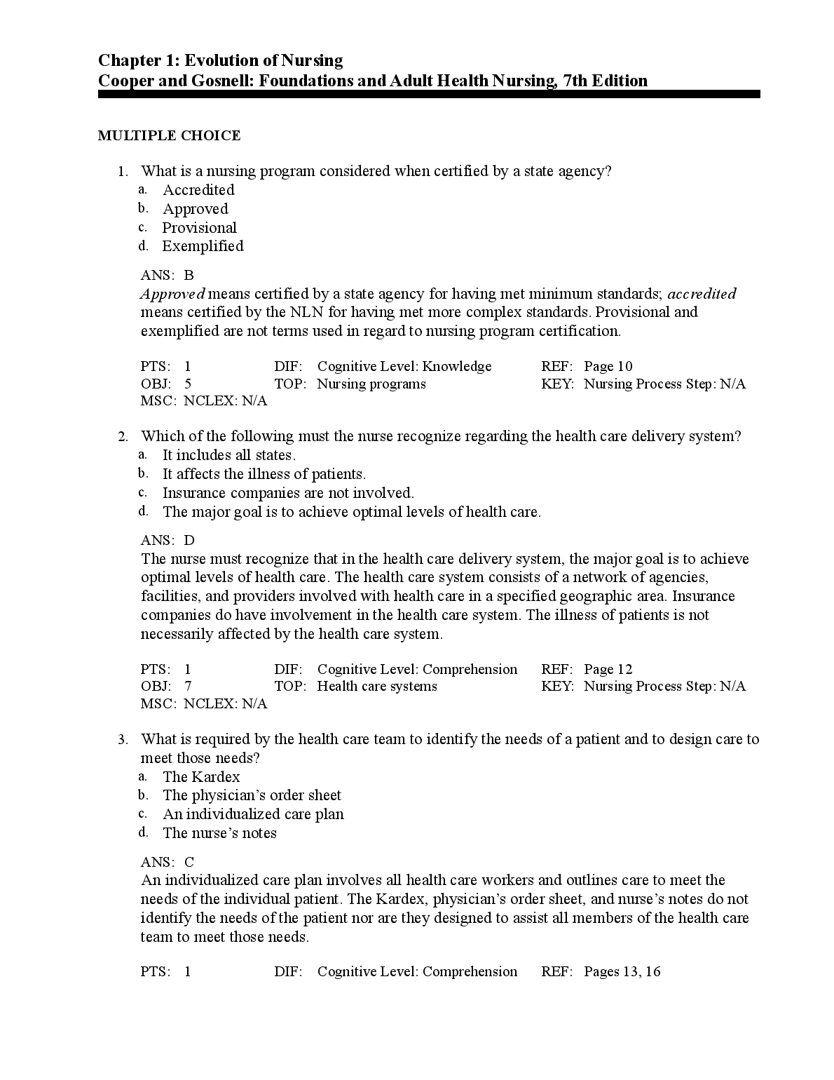 Test Bank for Foundations and Adult Health Nursing 7th Edition by Kim Cooper and Kelly Gosnell. Test Bank for Foundations and Adult Health Nursing 7th Edition by Kim Cooper and Kelly Gosnell TEST BANK