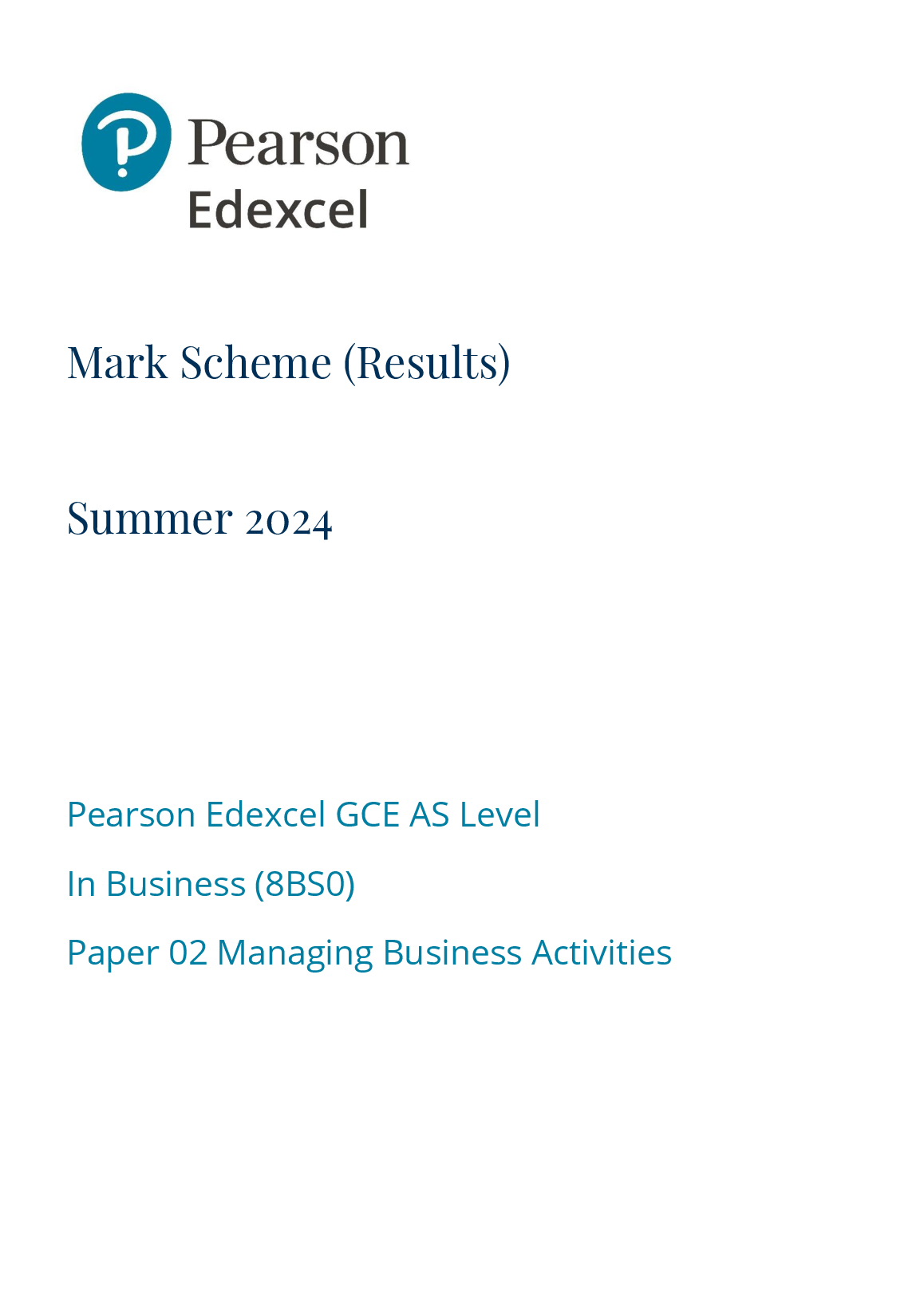 PEARSON EDEXCEL GCE AS LEVEL BUSINESS PAPER 2 MARK SCHEME 2024 (8BS0/02) Managing Business Activities. PEARSON EDEXCEL GCE AS LEVEL BUSINESS PAPER 2 MARK SCHEME 2024 (8BS0/02) Managing Business Activities Pearson Edexcel A and AS Papers and Mark Schemes