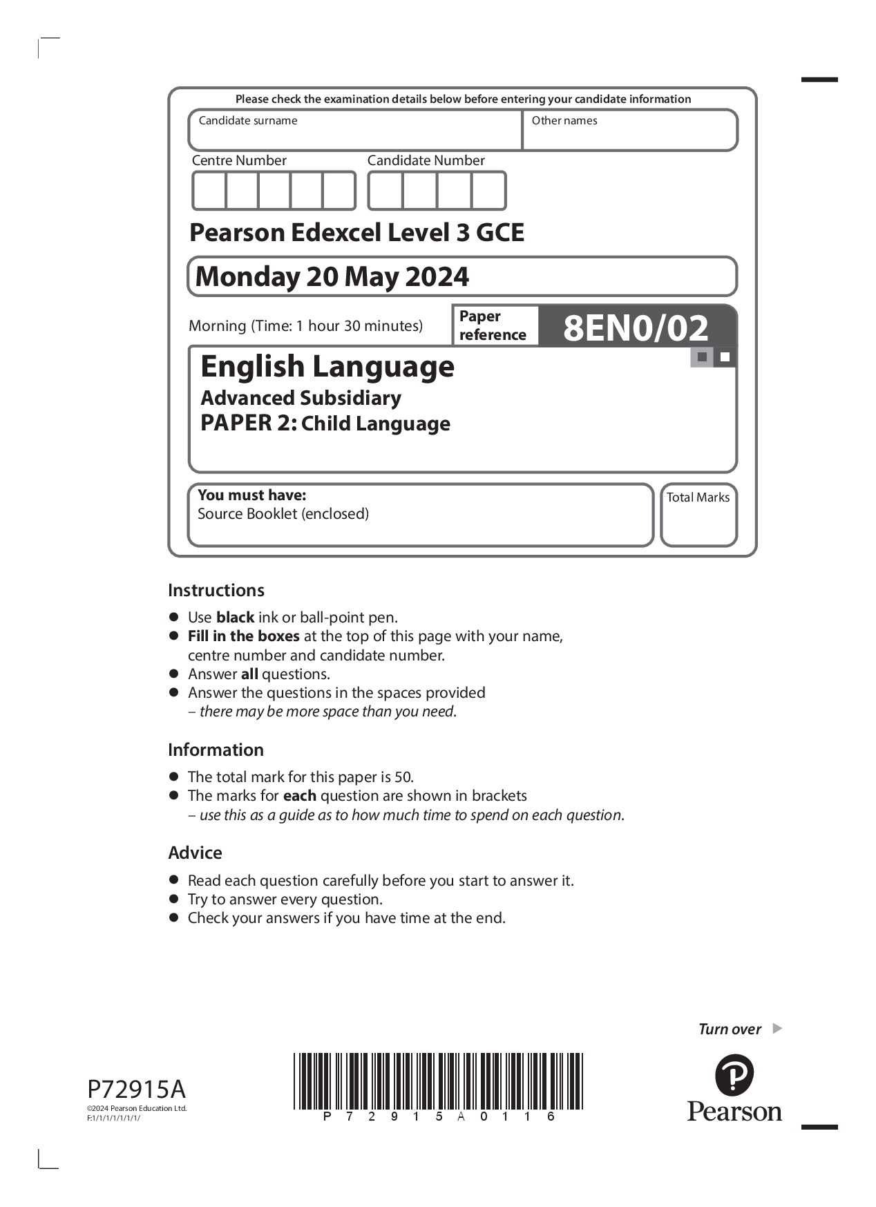 Pearson Edexcel GCE AS LEVEL English Language PAPER 2 QUESTION PAER 2024 : Child Language (8EN0/02). Pearson Edexcel GCE AS LEVEL English Language PAPER 2 QUESTION PAER 2024 : Child Language (8EN0/02) Pearson Edexcel A and AS Papers and Mark Schemes