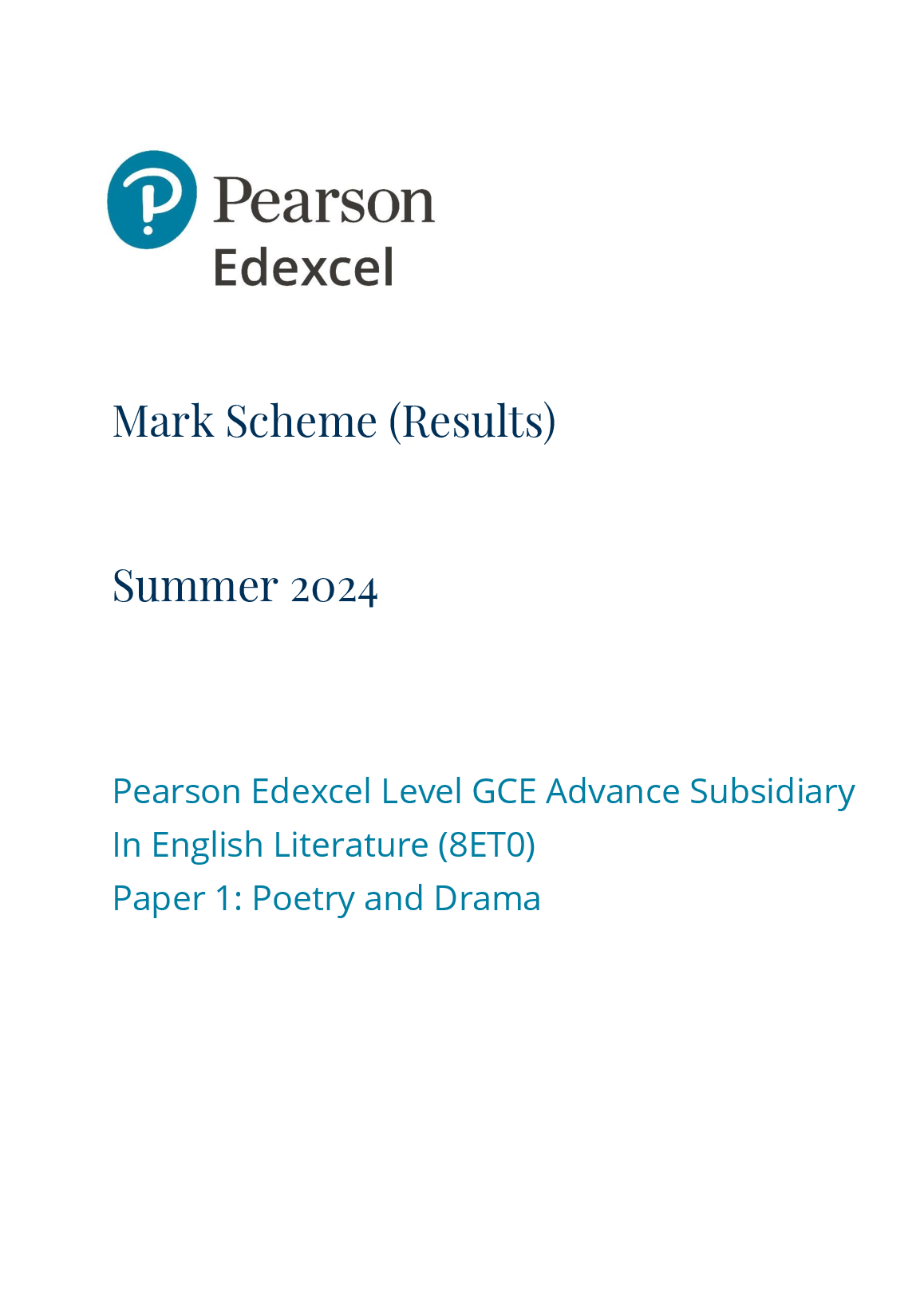 PEARSON EDEXCEL GCE AS LEVEL English LiteraturePAPER 1 MARK SCHEME 2024: Poetry and Drama (8ET0/01). PEARSON EDEXCEL GCE AS LEVEL English LiteraturePAPER 1 MARK SCHEME 2024: Poetry and Drama (8ET0/01) Pearson Edexcel A and AS Papers and Mark Schemes