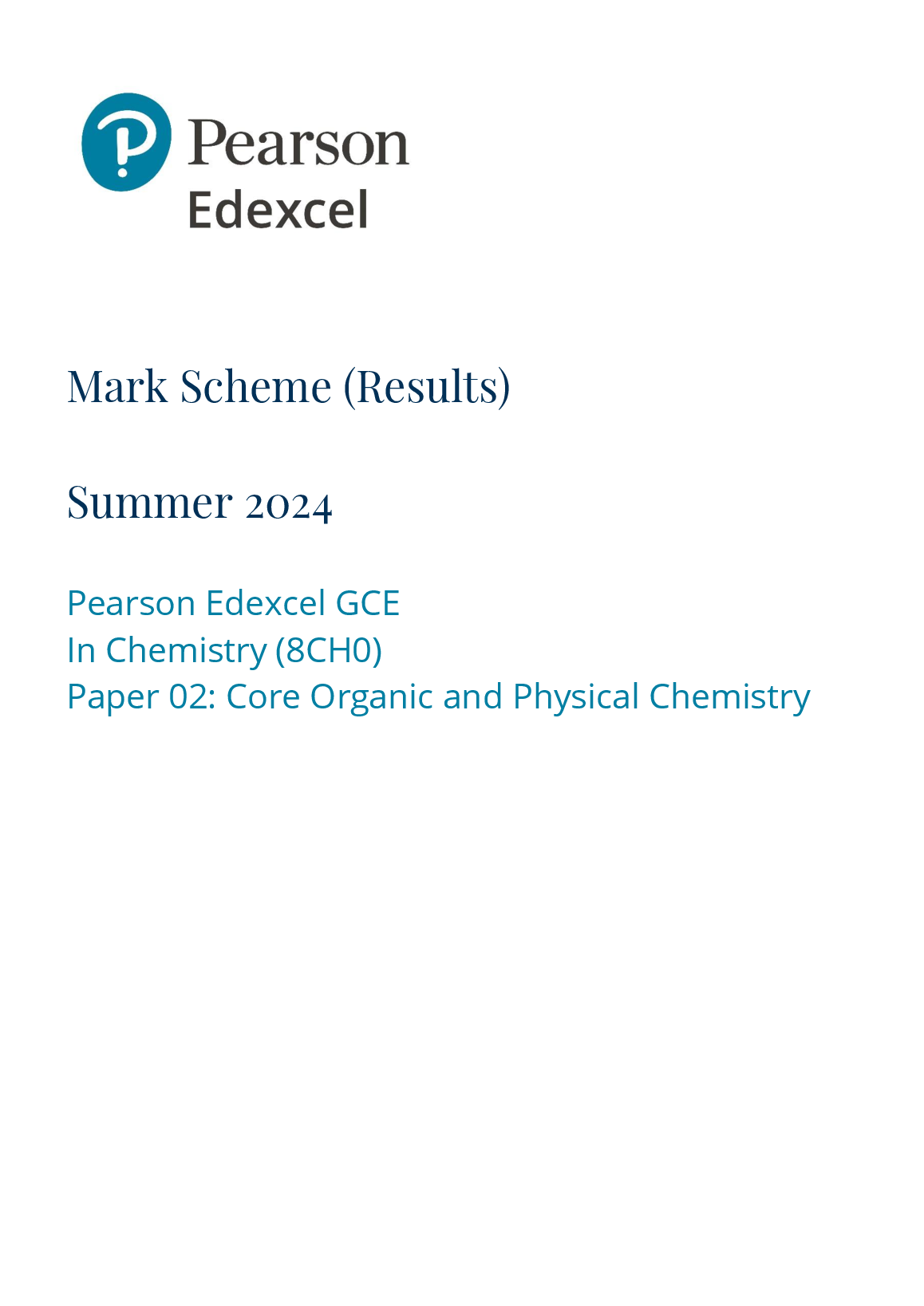 Pearson Edexcel Level AS GCE LEVEL Chemistry (Advanced Subsidiary) PAPER 2 MARK SCHEME 2024;Core Organic and Physical Chemistry (8CH0/02). Pearson Edexcel Level AS GCE LEVEL Chemistry (Advanced Subsidiary) PAPER 2 MARK SCHEME 2024;Core Organic and Physical Chemistry (8CH0/02) Pearson Edexcel A and AS Papers and Mark Schemes