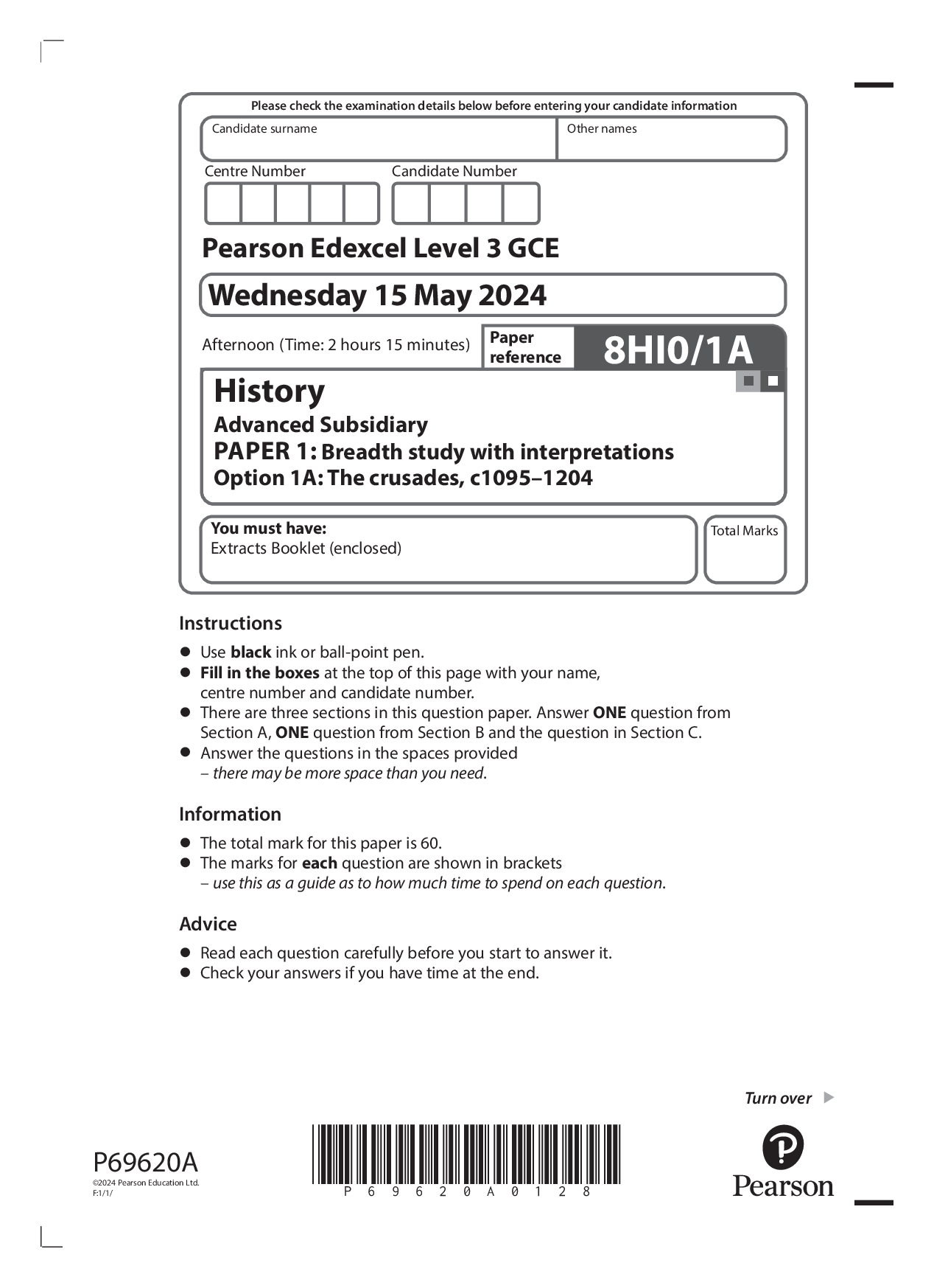 Pearson Edexcel GCE AS Level History PAPER 1: Breadth study with interpretations Option 1A: The crusades, c1095–1204 (8HI0/1A). Pearson Edexcel GCE AS Level History PAPER 1: Breadth study with interpretations Option 1A: The crusades, c1095–1204 (8HI0/1A) Pearson Edexcel A and AS Papers and Mark Schemes