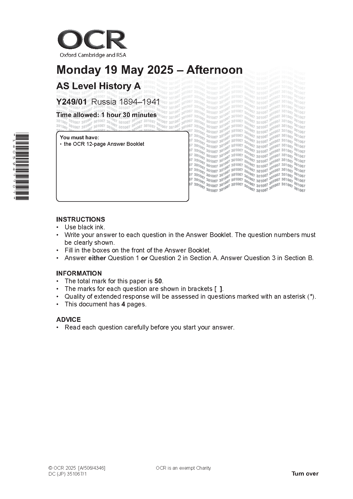 2025 OCR AS Level History A Paper 1 and Mark Scheme Combined (Y249/01 Russia 1894–1941 ). 2025 OCR AS Level History A Paper 1 and Mark Scheme Combined (Y249/01 Russia 1894–1941 ) OCR GCE A & AS LEVEL Papers and Mark Schemes