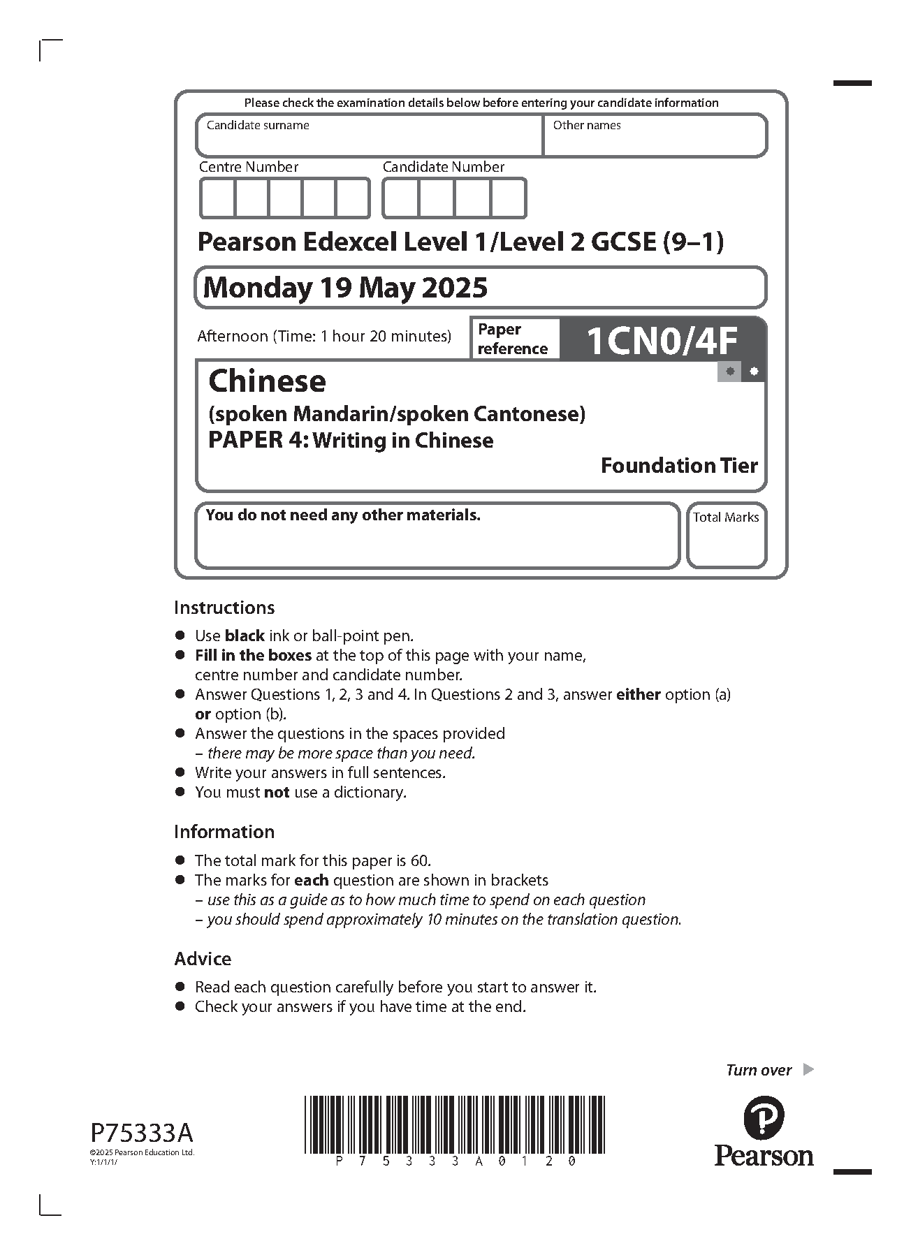 2025 Pearson Edexcel GCSE Chinese Paper 4F and Mark Scheme Combined (1CN0/4F: Writing in Chinese Foundation Tier). 2025 Pearson Edexcel GCSE Chinese Paper 4F and Mark Scheme Combined (1CN0/4F: Writing in Chinese Foundation Tier) Edexcel
