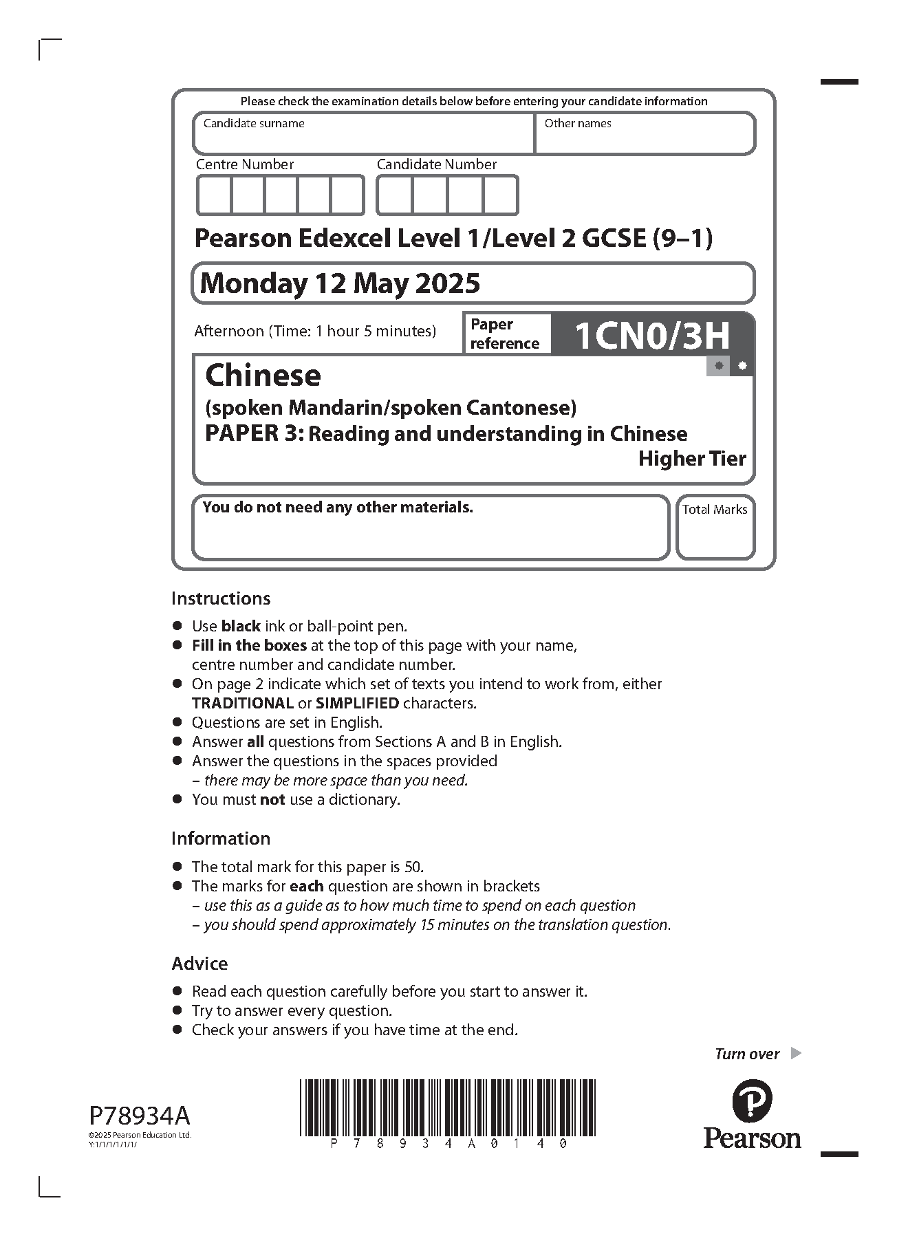 2025 Pearson Edexcel GCSE Chinese Paper 3H and Mark Scheme Combined (1CN0/3H: Reading and understanding in Chinese Higher Tier). 2025 Pearson Edexcel GCSE Chinese Paper 3H and Mark Scheme Combined (1CN0/3H: Reading and understanding in Chinese Higher Tier) Edexcel
