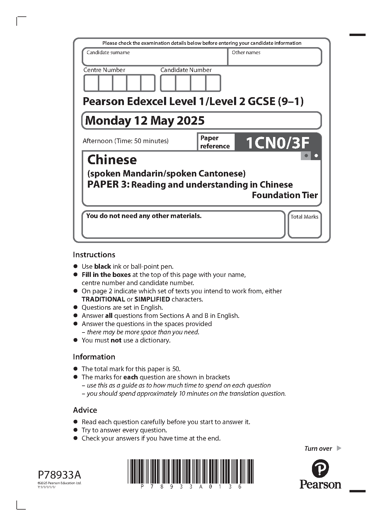 2025 Pearson Edexcel GCSE Chinese Paper 3F and Mark Scheme Combined (1CN0/3F: Reading and understanding in Chinese Foundation Tier). 2025 Pearson Edexcel GCSE Chinese Paper 3F and Mark Scheme Combined (1CN0/3F: Reading and understanding in Chinese Foundation Tier) Edexcel