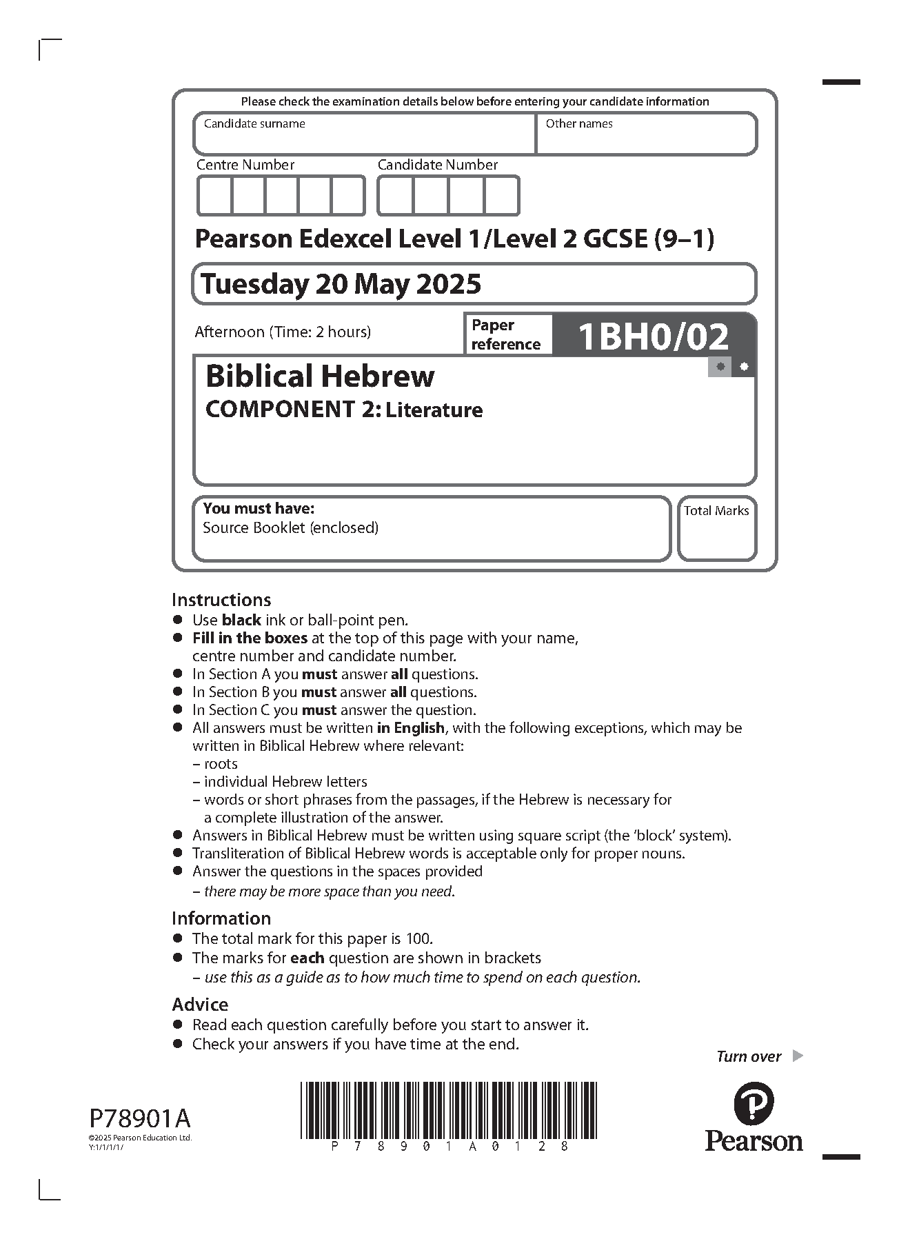 2025 Pearson Edexcel GCSE Biblical Hebrew Paper 2 Question Paper and Mark Scheme Combined (1BH0/02: Literature). 2025 Pearson Edexcel GCSE Biblical Hebrew Paper 2 Question Paper and Mark Scheme Combined (1BH0/02: Literature) Edexcel