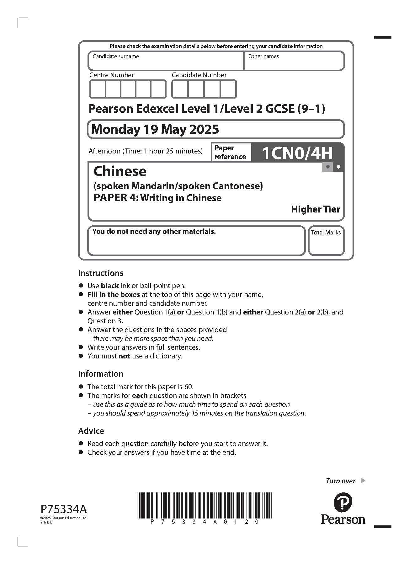 2025 pearson edexcel gcse chinese paper 4h and mark scheme combined (1cn0/4h: writing in chinese higher tier)
