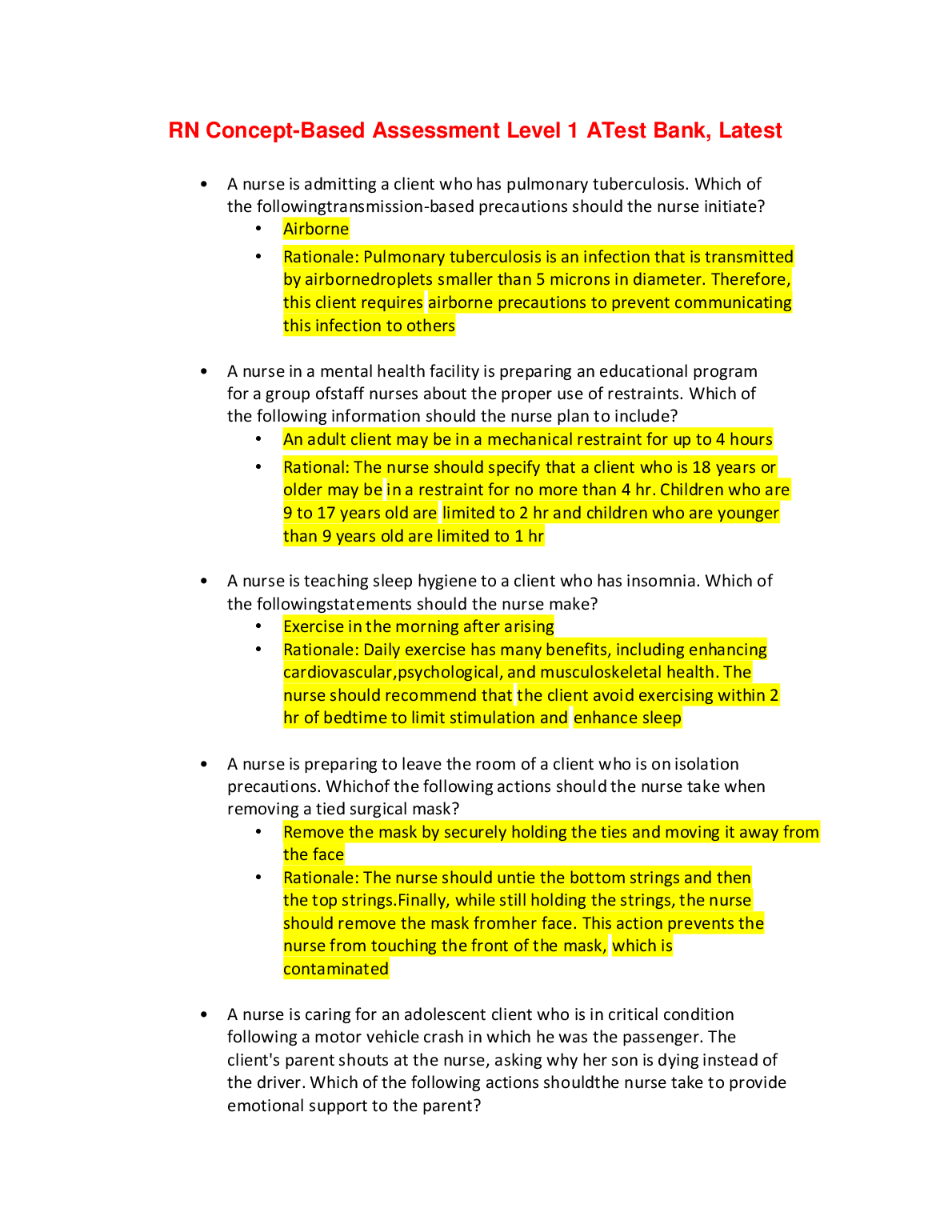 RN Concept-Based Assessment Level 1 A Test Bank, Latest Solution. RN Concept-Based Assessment Level 1 A Test Bank, Latest Solution ATI