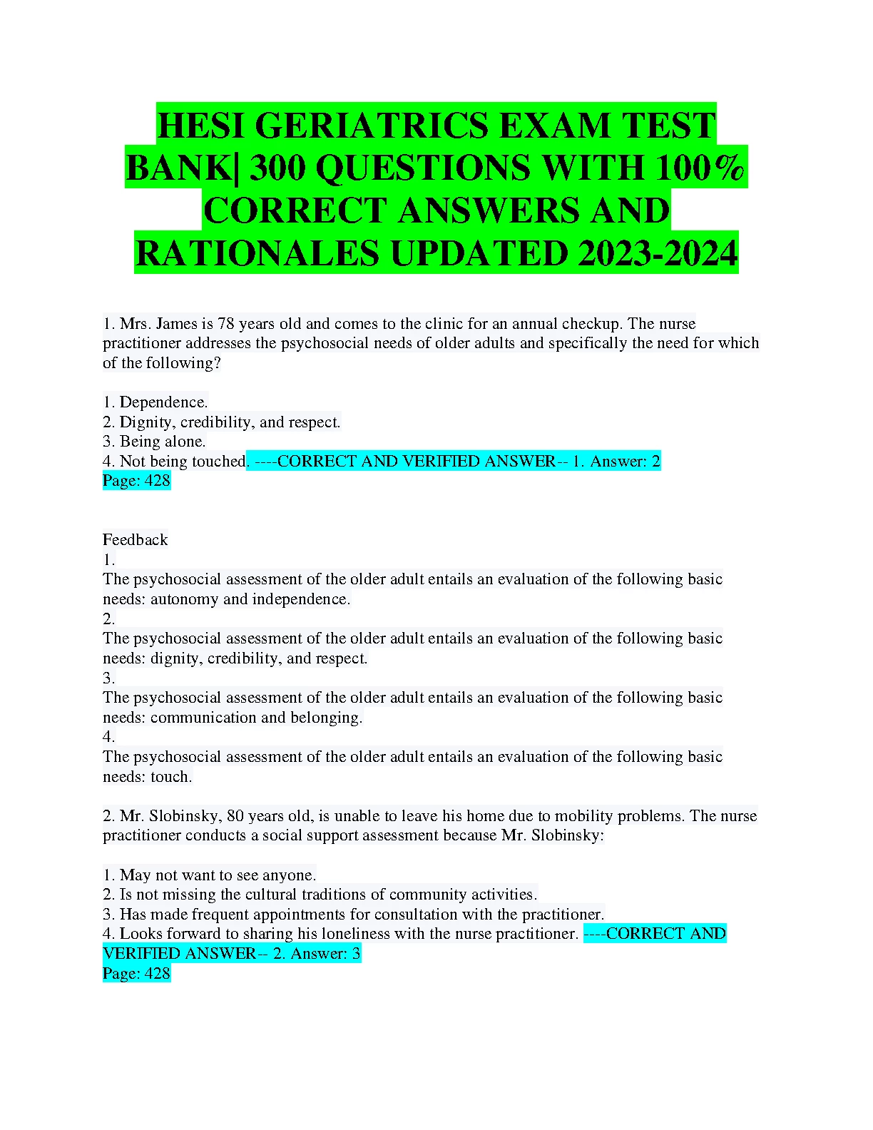 HESI GERIATRICS EXAM TEST BANK 300 QUESTIONS WITH 100% CORRECT ANSWERS AND RATIONALES UPDATED 2024. HESI GERIATRICS EXAM TEST BANK 300 QUESTIONS WITH 100% CORRECT ANSWERS AND RATIONALES UPDATED 2024 TEST BANK
