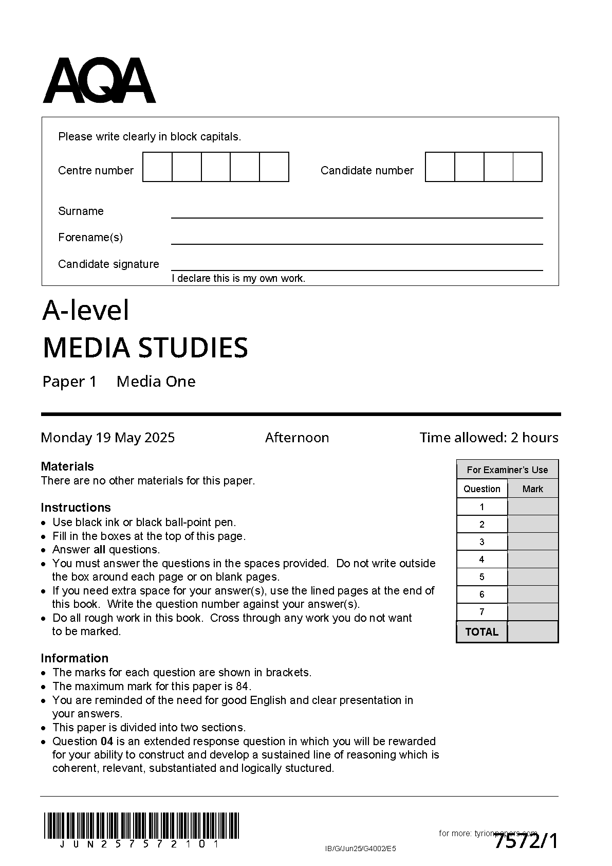 aqa a level media studies paper 1 2025 (7572/1: media one). download this verified paper on www.leakedexams.com and acce...