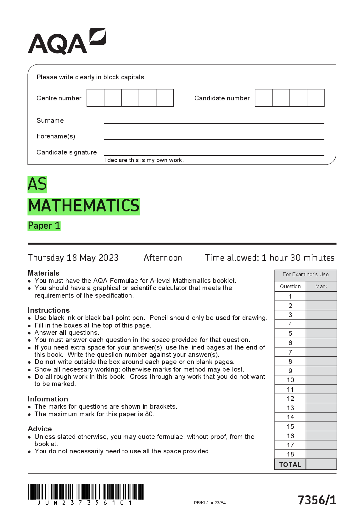 aqa as level mathematics paper 1 question paper 2023 (7356/1). download official and verified aqa as level mathematics p...