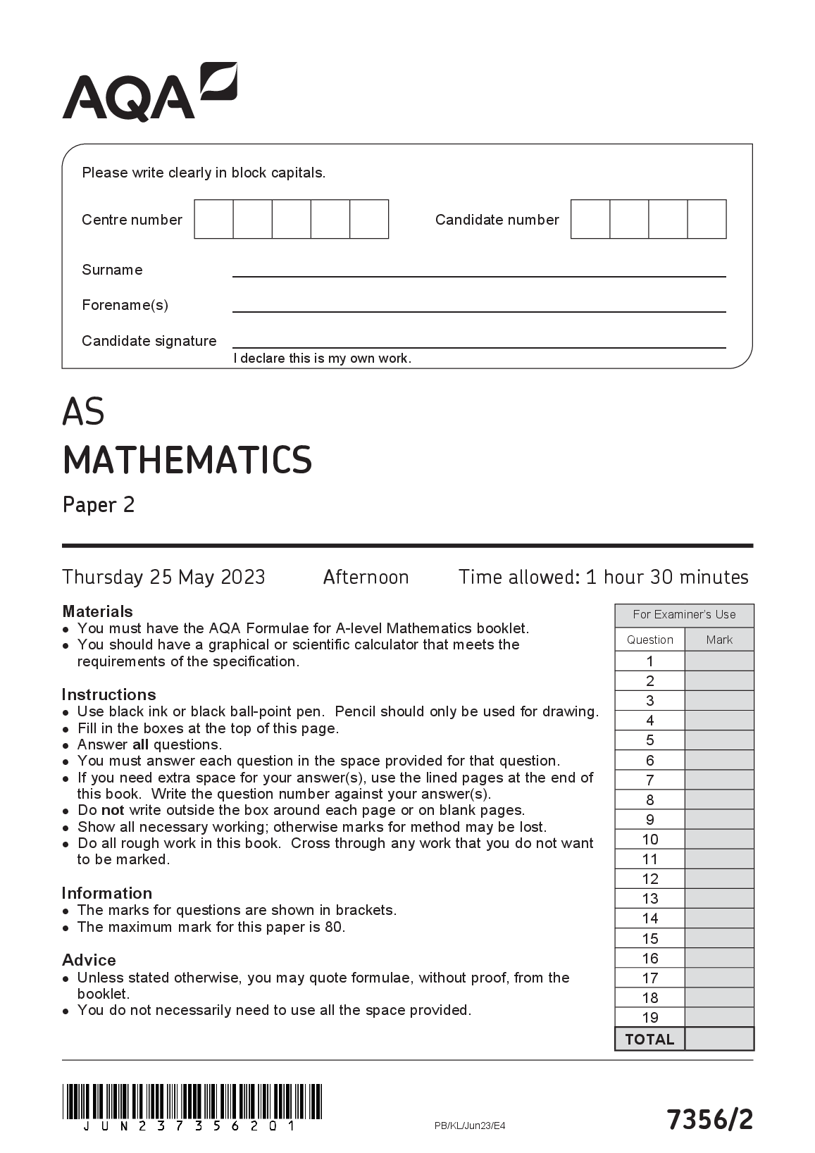 aqa as level mathematics paper 2 question paper 2023 (7356/2). download official and verified aqa as level mathematics p...