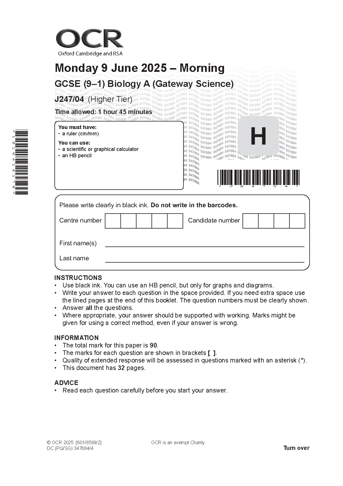 OCR GCSE Biology A Higher Tier PAPER 4 + MARK SCHEME J247/04 2025. OCR GCSE Biology A Higher Tier PAPER 4 + MARK SCHEME J247/04 2025 OCR GCSE Papers & mark schemes