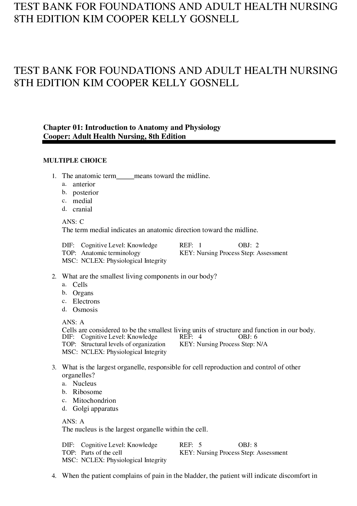 TEST BANK FOR FOUNDATIONS AND ADULT HEALTH NURSING 8TH EDITION KIM COOPER KELLY GOSNELL. TEST BANK FOR FOUNDATIONS AND ADULT HEALTH NURSING 8TH EDITION KIM COOPER KELLY GOSNELL TEST BANK