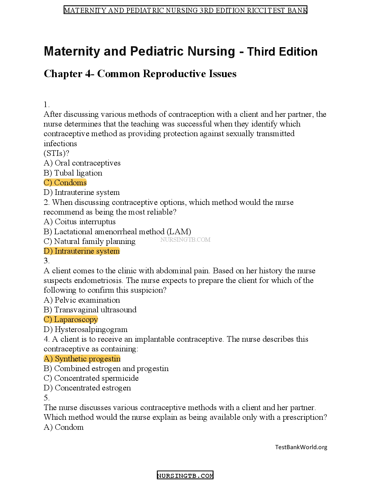 TEST BANK MATERNITY AND PEDIATRIC NURSING 3RD EDITION (RICCI). TEST BANK MATERNITY AND PEDIATRIC NURSING 3RD EDITION (RICCI) TEST BANK
