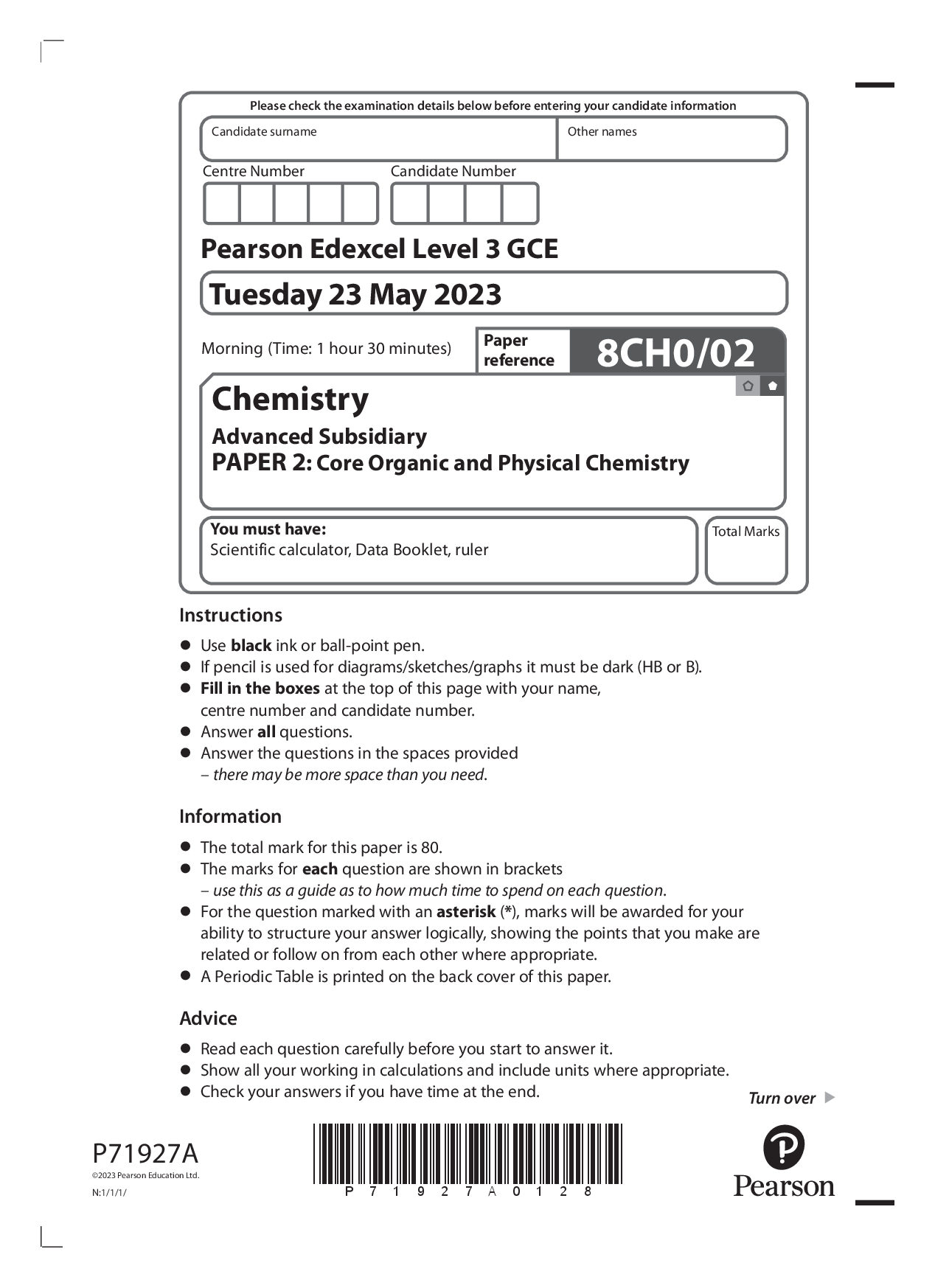 pearson edexcel as level chemistry paper 2 2023 question paper (8ch0/02: core organic and physical chemistry). download...