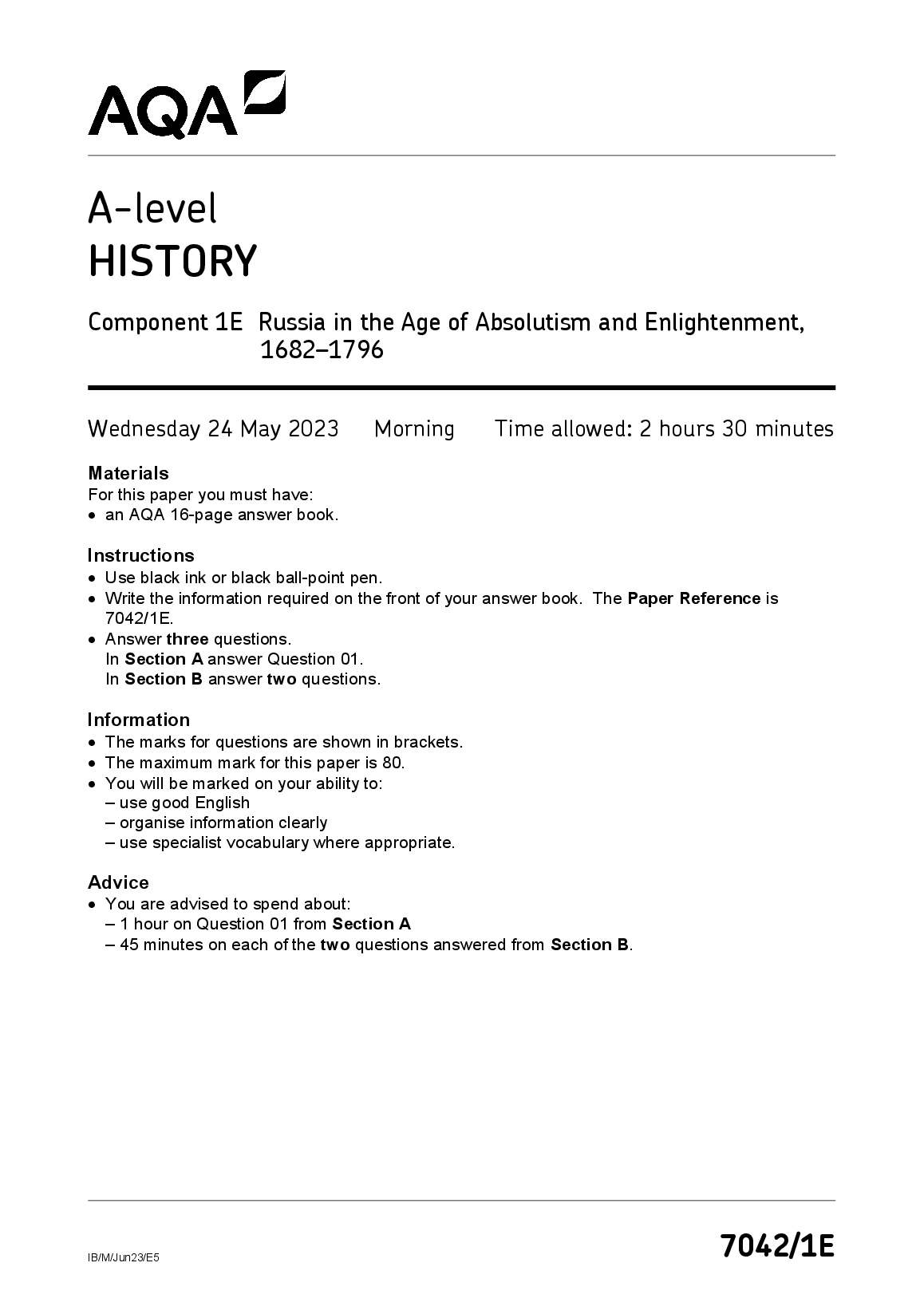 AQA A LEVEL HISTORY PAPER 1 QUESTION PAPER 2023 (7042/1E: Russia in the Age of Absolutism and Enlightenment, 1682–1796). AQA A LEVEL HISTORY PAPER 1 QUESTION PAPER 2023 (7042/1E: Russia in the Age of Absolutism and Enlightenment, 1682–1796) AQA papers mark schemes