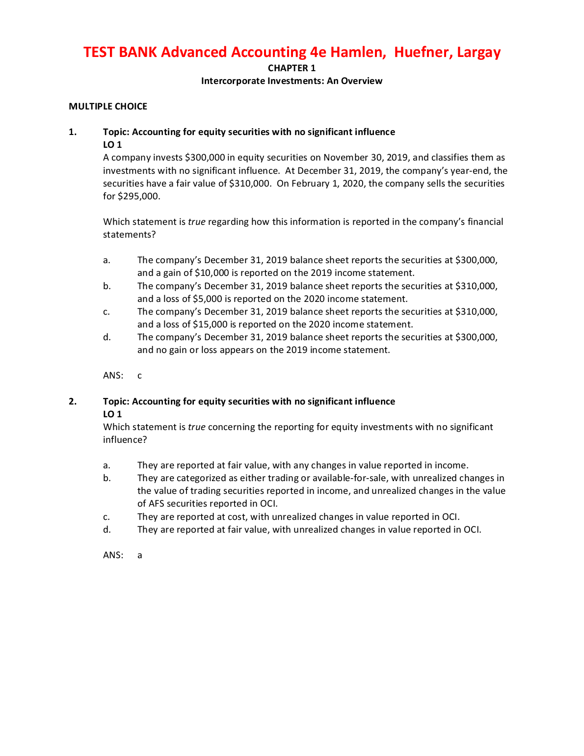 TEST BANK Advanced Accounting 4e Hamlen, Huefner, Largay. TEST BANK Advanced Accounting 4e Hamlen, Huefner, Largay TEST BANK