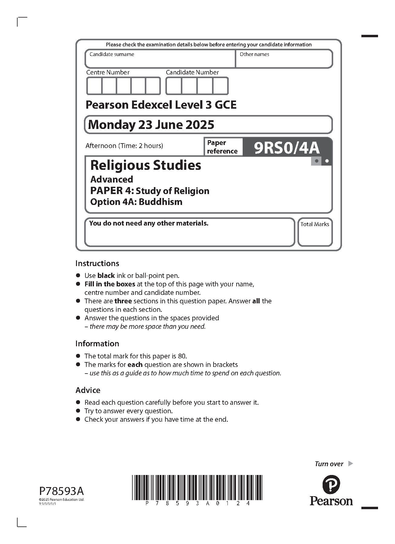 2025 Pearson Edexcel A Level Religious Studies PAPER 4 and Mark Scheme Combined (9RS0/4A: Buddhism). 2025 Pearson Edexcel A Level Religious Studies PAPER 4 and Mark Scheme Combined (9RS0/4A: Buddhism) Pearson Edexcel A and AS Papers and Mark Schemes