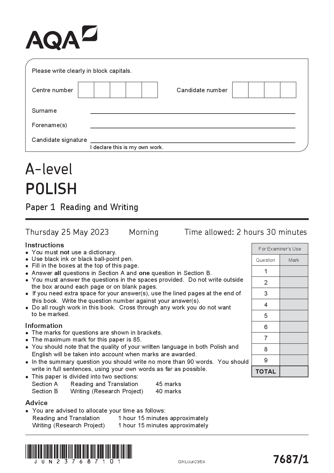 aqa a level polish paper 1 question paper (7687/1: reading and writing). download the official and verified paper on www...