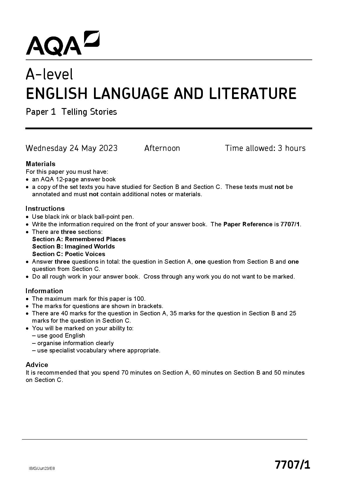 2023 aqa a level english language and literature paper 1 question paper (7707/1: telling stories).