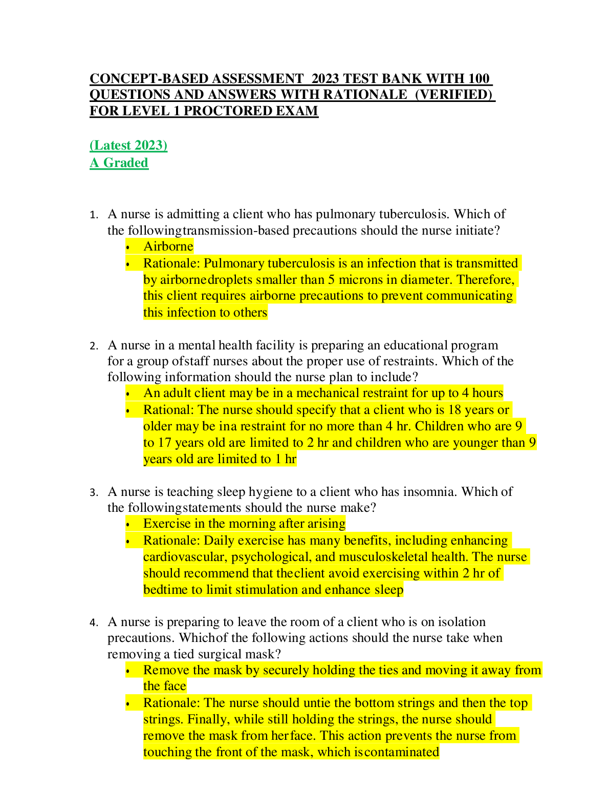 CONCEPT-BASED ASSESSMENT 2023/2024 TEST BANK WITH 100 QUESTIONS AND ANSWERS WITH RATIONALE (VERIFIED) FOR LEVEL 1 PROCTORED EXAM. CONCEPT-BASED ASSESSMENT 2023/2024 TEST BANK WITH 100 QUESTIONS AND ANSWERS WITH RATIONALE (VERIFIED) FOR LEVEL 1 PROCTORED EXAM ATI