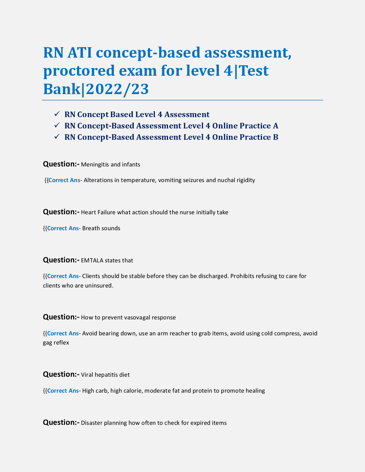 RN ATI concept-based assessment, proctored exam for level 4 Test Bank 2023/2024. RN ATI concept-based assessment, proctored exam for level 4 Test Bank 2023/2024 ATI