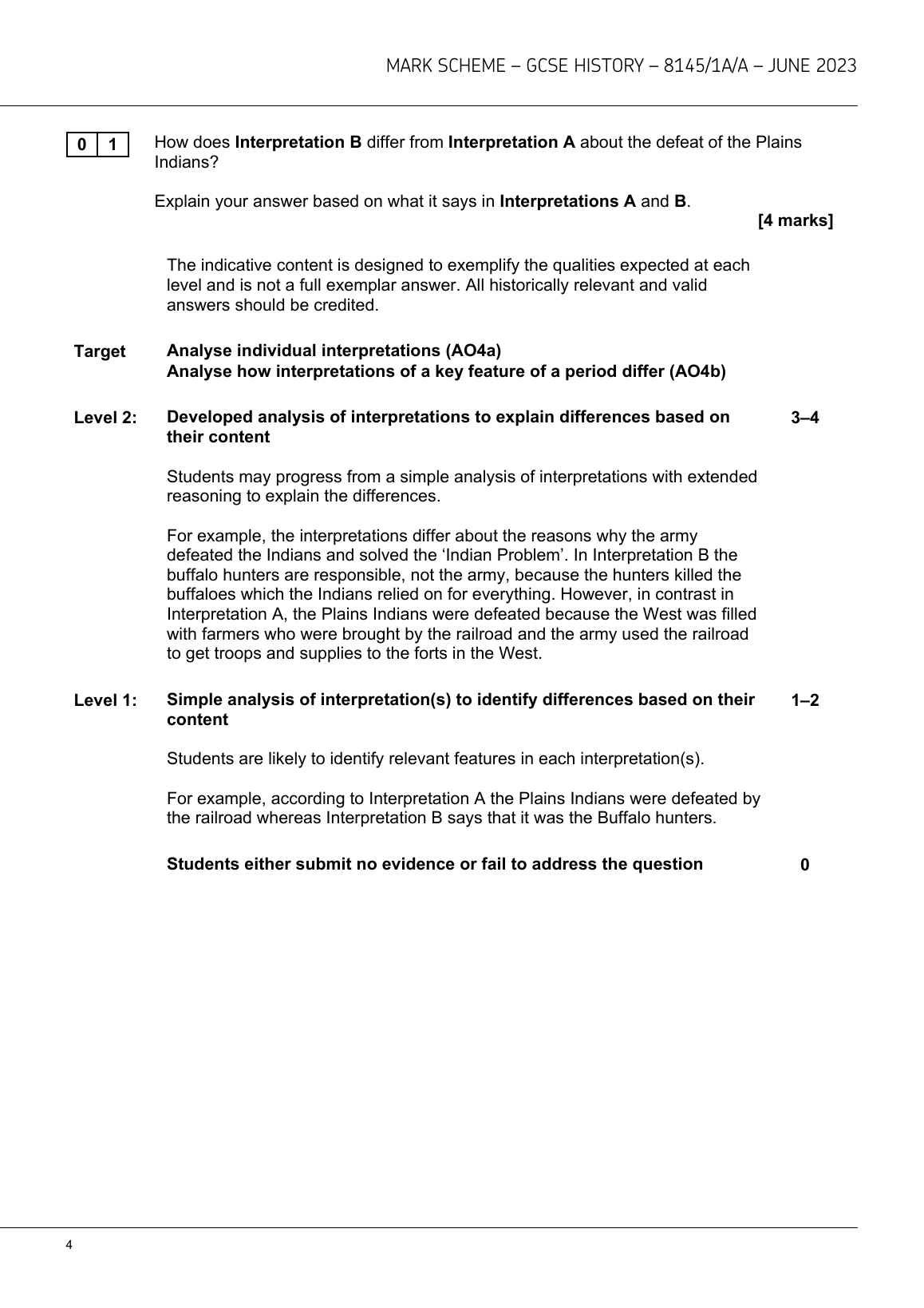 AQA GCSE HISTORY PAPER 1 MARK SCHEME 2023 (8145/1A/A: America, 1840–1895: Expansion and consolidation)