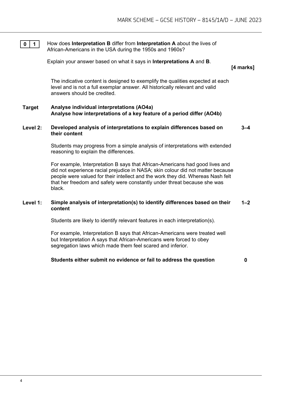 AQA GCSE HISTORY PAPER 1 MARK SCHEME 2023 (8145/1A/D: America, 1920–1973: Opportunity and inequality)