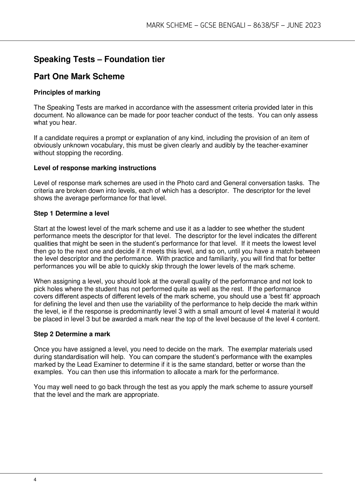 AQA GCSE BENGALI PAPER 2 MARK SCHEME 2023 (8638/SF: Speaking Foundation)