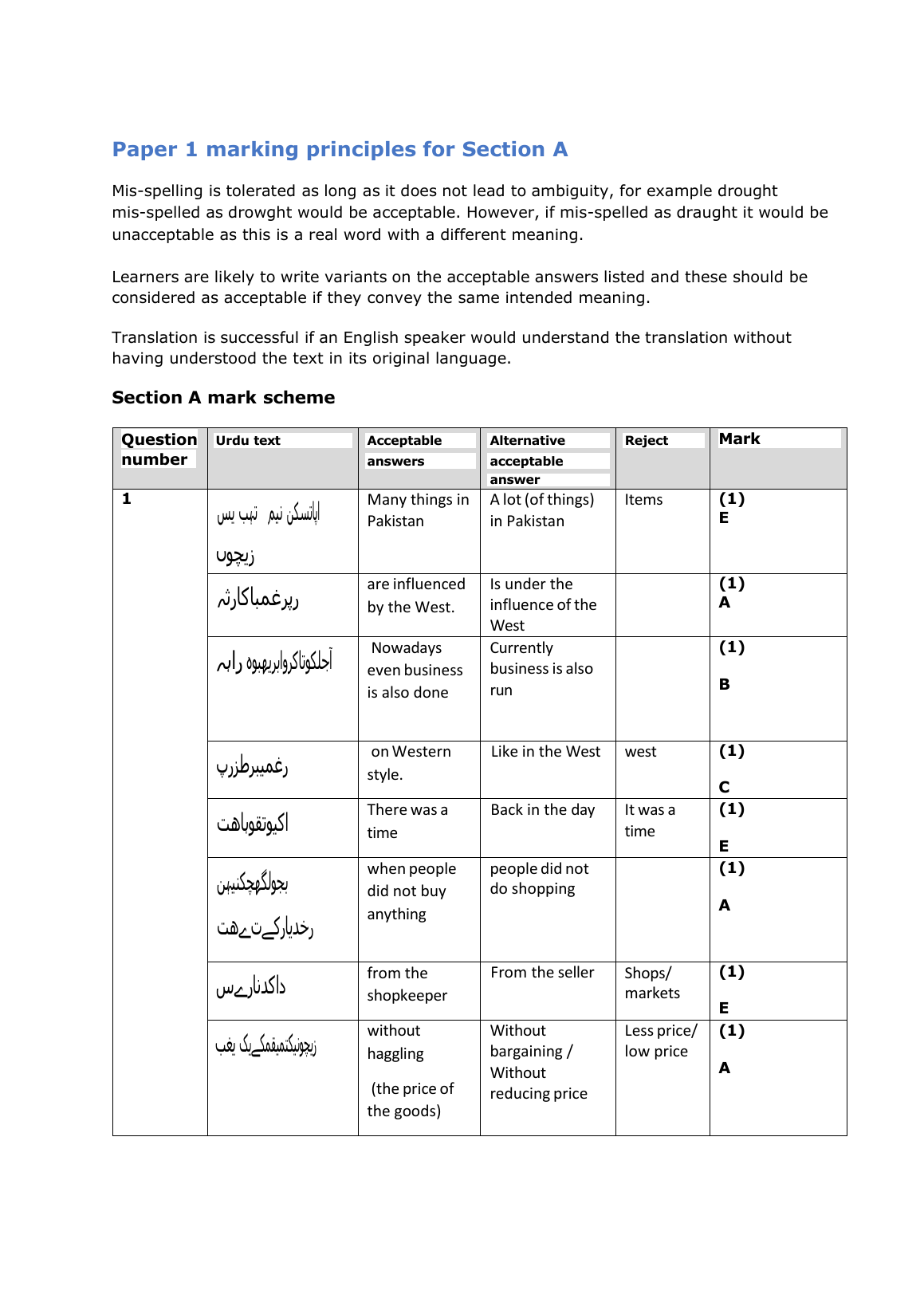 PEARSON EDEXCEL A LEVEL Urdu PAPER 1 2023 MARK SCHEME (9UR0/01: Translation into English)