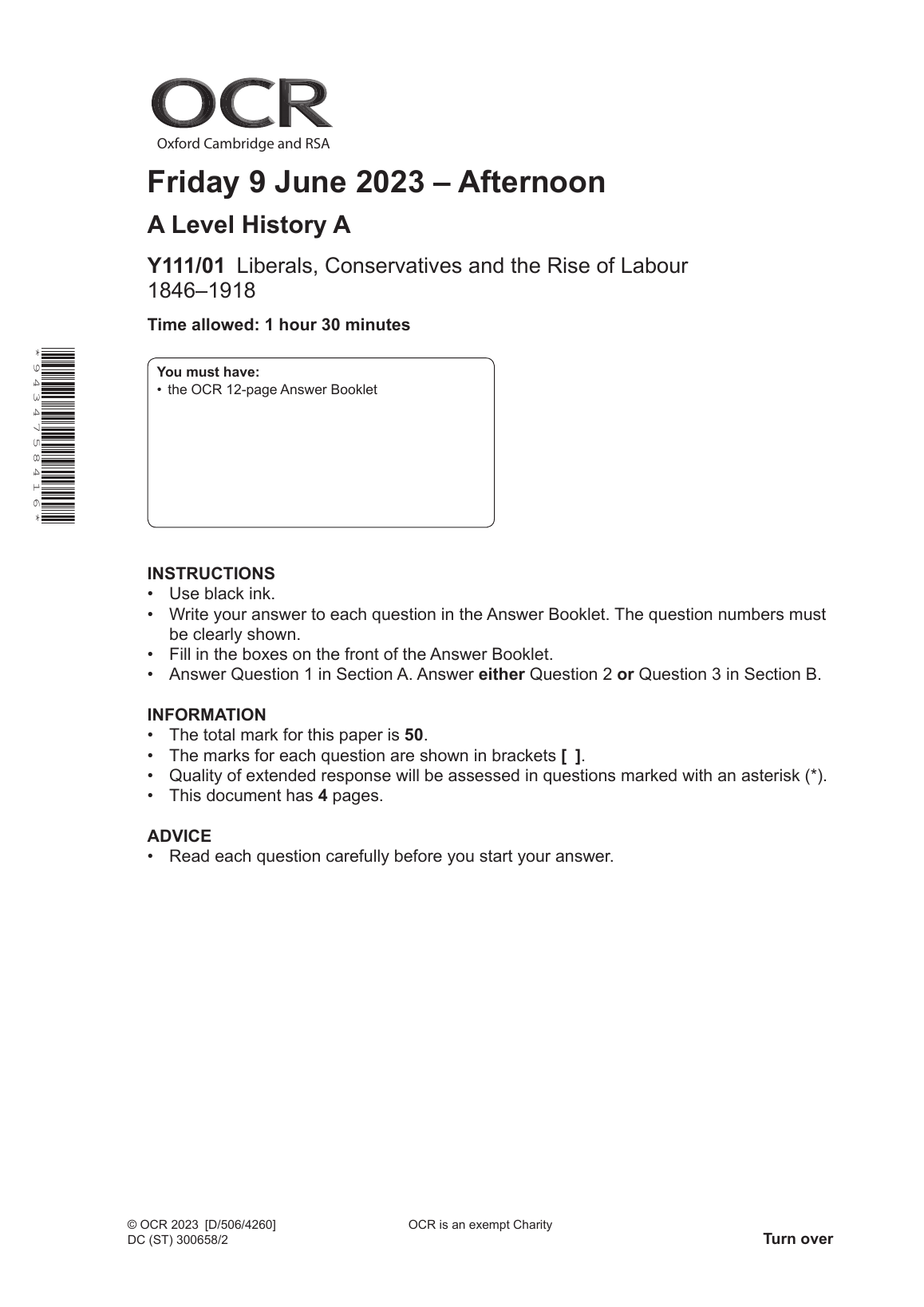 OCR GCE A LEVEL HISTORY A PAPER 1 QUESTION PAPER 2023 (Y111/01: Liberals, Conservatives and the Rise of Labour 1846â1918). DOWNLOAD OFFICIAL AND VERIFIED OCR A LEVEL HISTORY A PAPER 1 QUESTION PAPER 2023 ON www.leakedexams.com.
