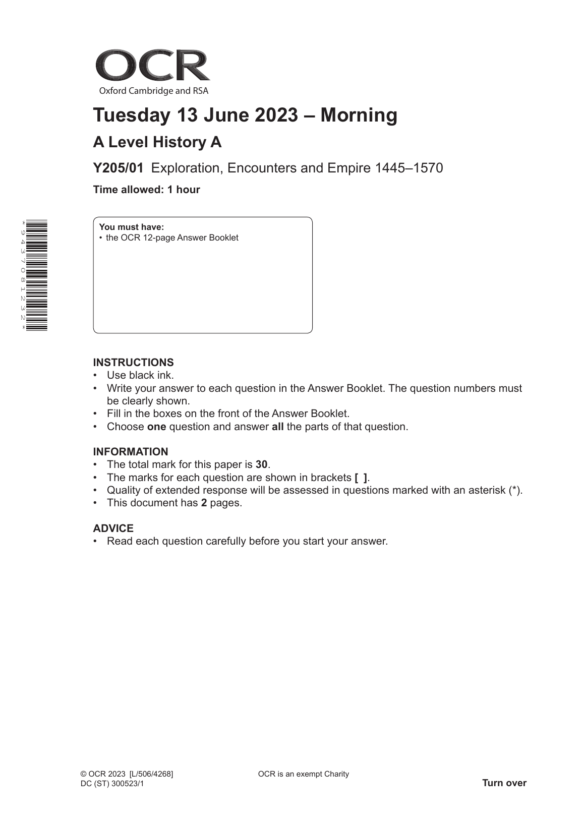 OCR GCE A LEVEL HISTORY A PAPER 1 QUESTION PAPER 2023 (Y205/01: Exploration, Encounters and Empire 1445–1570). DOWNLOAD OFFICIAL AND VERIFIED OCR A LEVEL HISTOR...