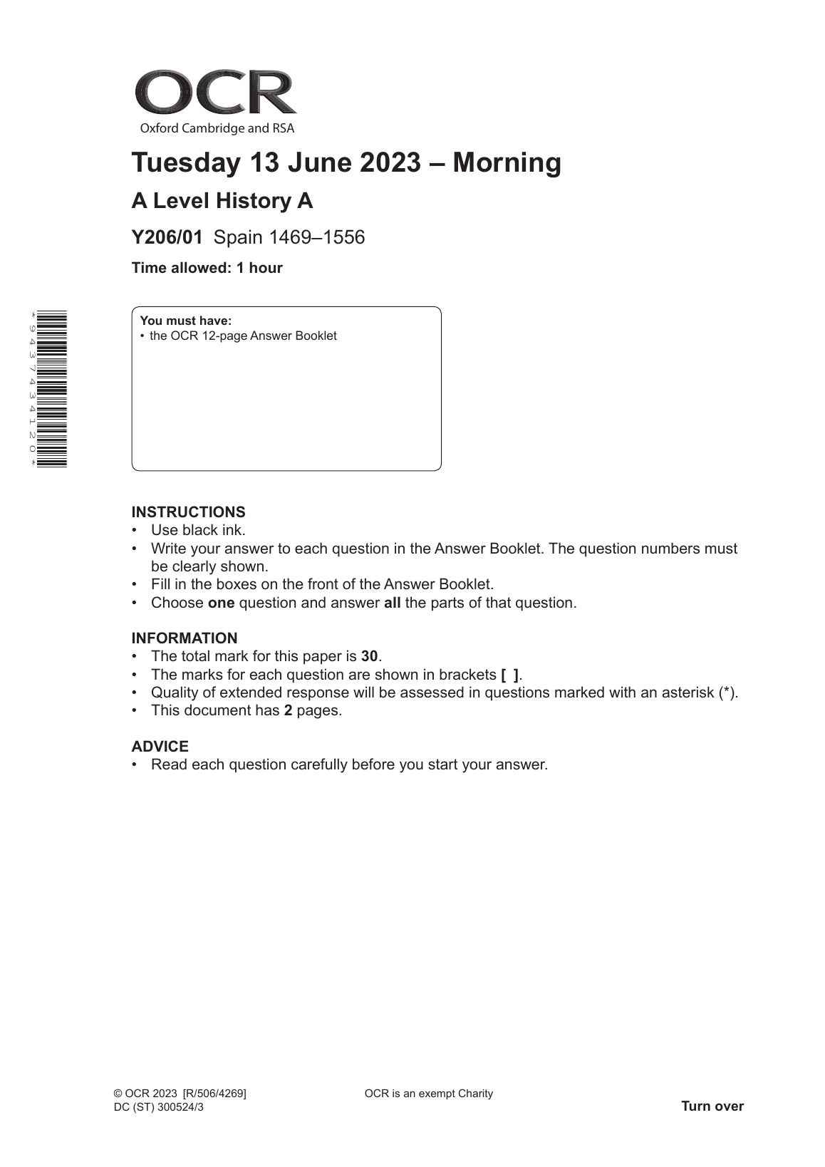 OCR GCE A LEVEL HISTORY A PAPER 1 QUESTION PAPER 2023 (Y206/01: Spain 1469–1556). DOWNLOAD OFFICIAL AND VERIFIED OCR A LEVEL HISTORY A PAPER 1 QUESTION PAPER 2023 ON www.leakedexams.com.