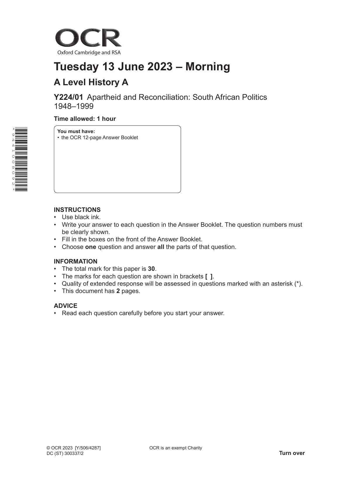 OCR GCE A LEVEL HISTORY A PAPER 1 QUESTION PAPER 2023 (Y224/01: Apartheid and Reconciliation: South African Politics 1948â1999). DOWNLOAD OFFICIAL AND VERIFIED OCR A LEVEL HISTORY A PAPER 1 QUESTION PAPER 2023 ON www.leakedexams.com.