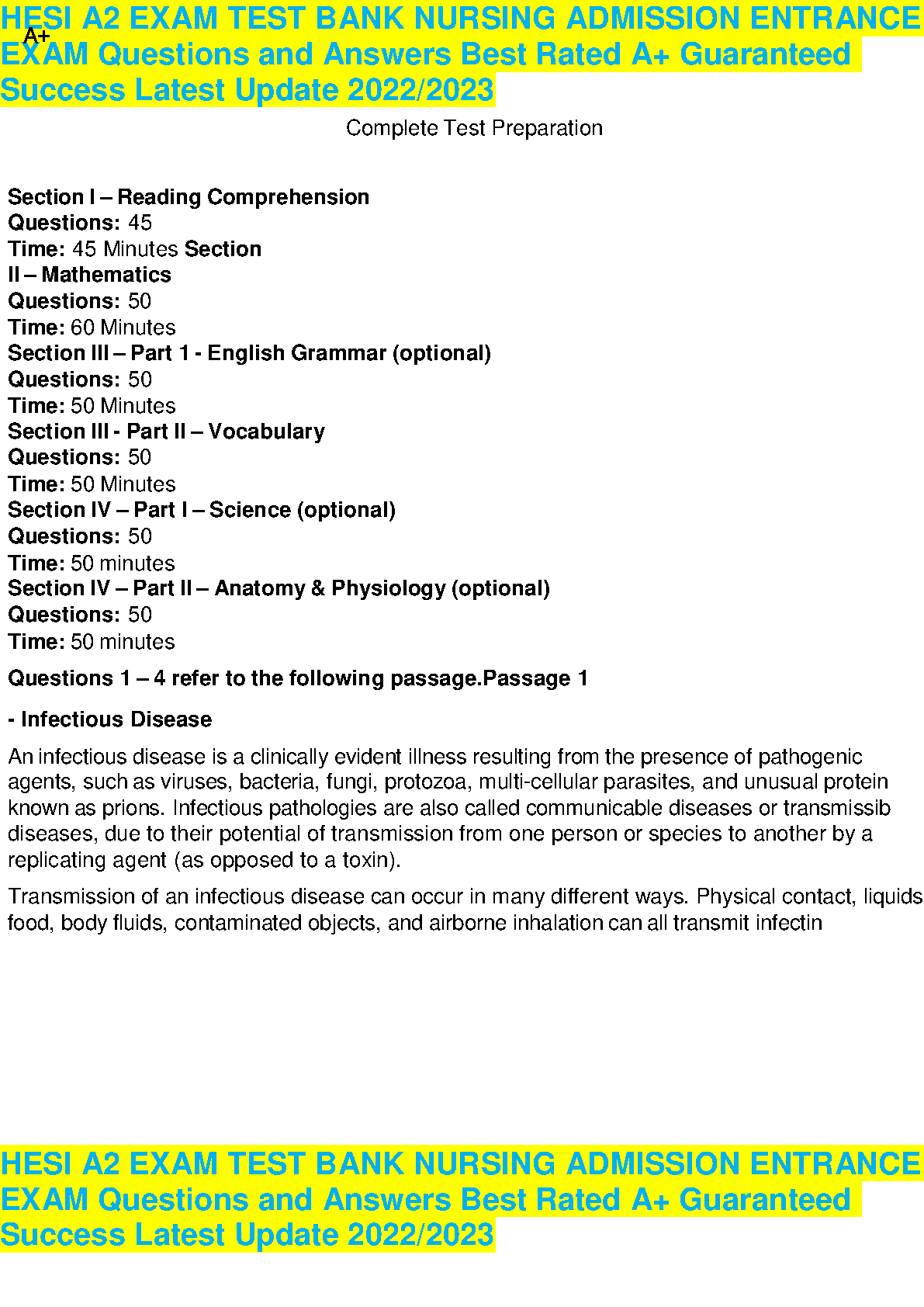 HESI A2 EXAM TEST BANK NURSING ADMISSION ENTRANCE EXAM 2024