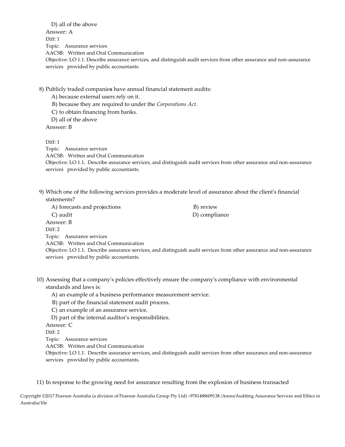 Test Bank for Auditing, Assurance Services & Ethics in Australia. 10th Edition by Alvin A Arens, Peter Best, Greg Shailer, and Brenton Fiedler